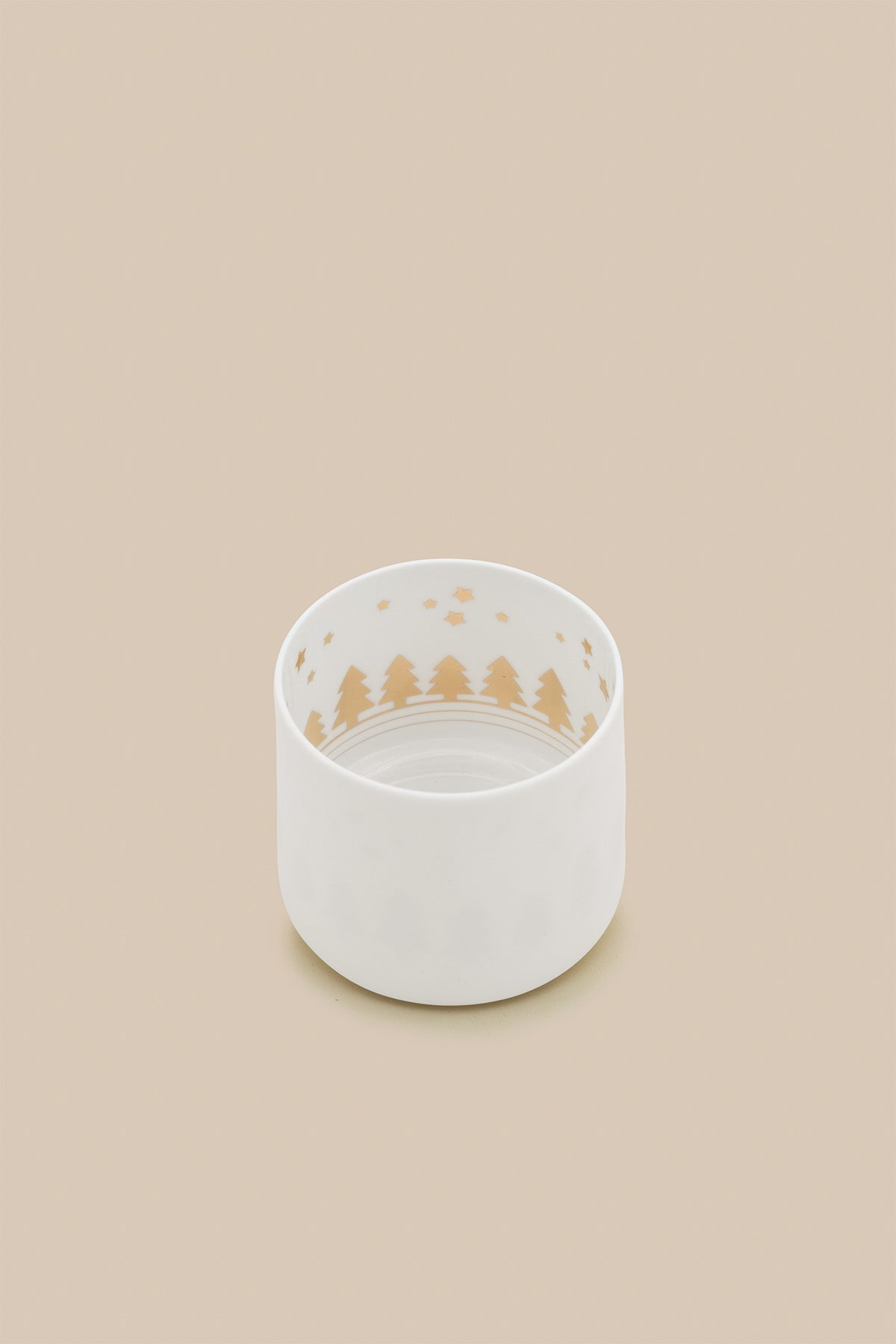 Çam Ağacı Desenli Porselen Mumluk, iç yüzeyindeki altın çam ağacı siluetleri ve yıldız detaylarıyla mum yandığında sıcak ve masalsı bir ışık yansıması oluşturur. Mat beyaz dış yüzeyi modern bir görünüm sunarken, altın tonlar mekâna kış ruhunu taşıyan zarif bir ambiyans katar. Sofralar, konsollar ve yılbaşı dekorasyonları için ideal bir tamamlayıcıdır.