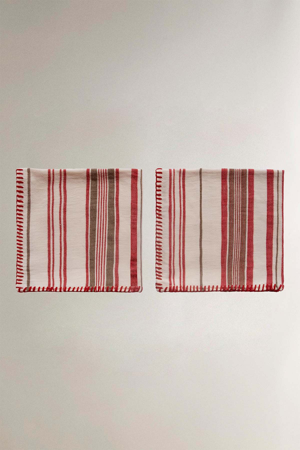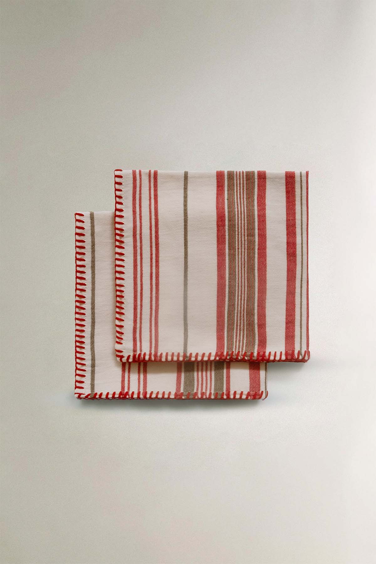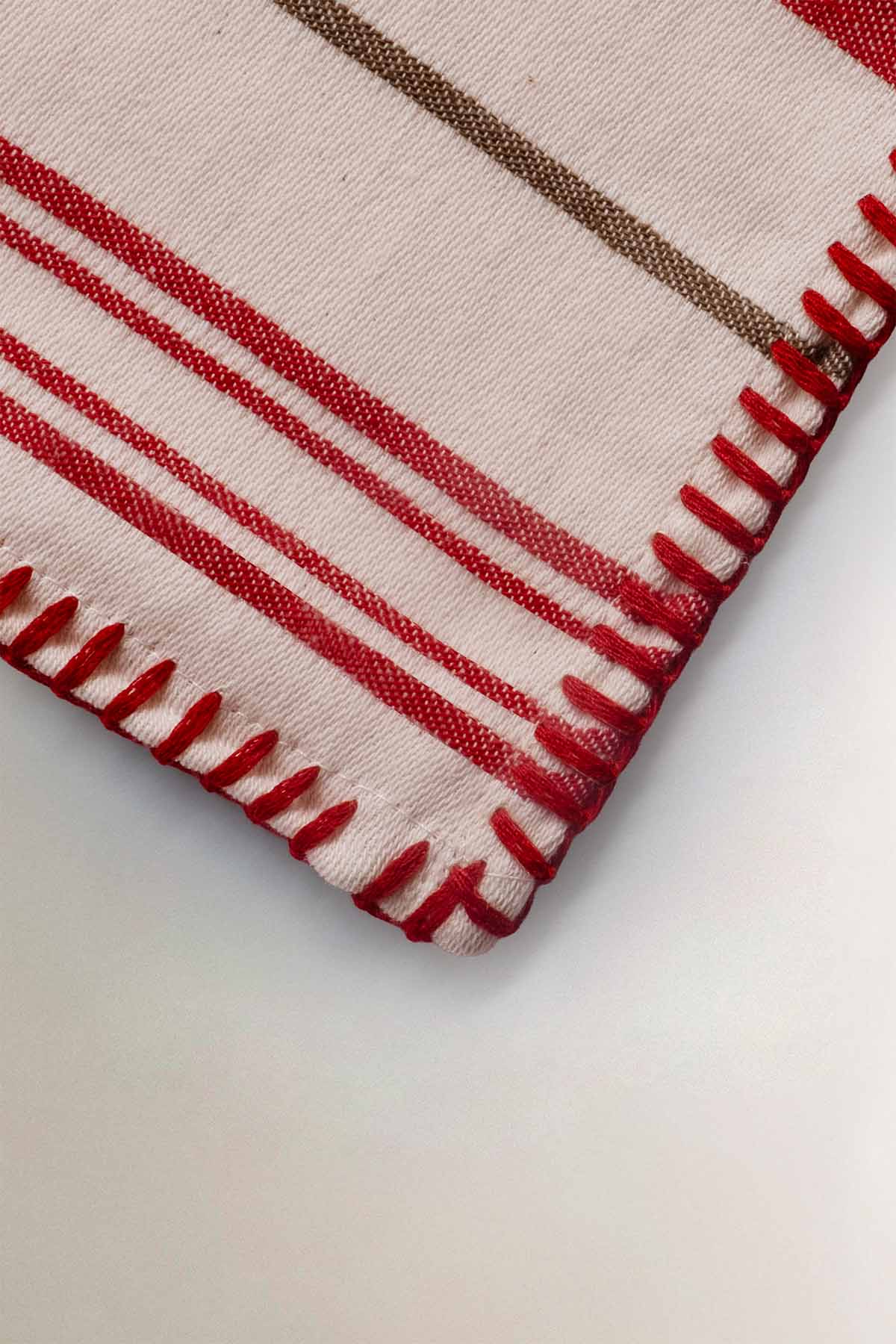 %100 pamuktan üretilen 2’li çizgili peçete seti, dekoratif dikişli kenar süslemesi ile sofralara sıcak ve zarif bir dokunuş katar. 45x45 cm ölçüsündeki bu peçeteler, iplik boya tekniğiyle üretilmiş dayanıklı kumaşı sayesinde uzun süre formunu korur. Masa örtüsüyle mükemmel bir uyum sağlar.