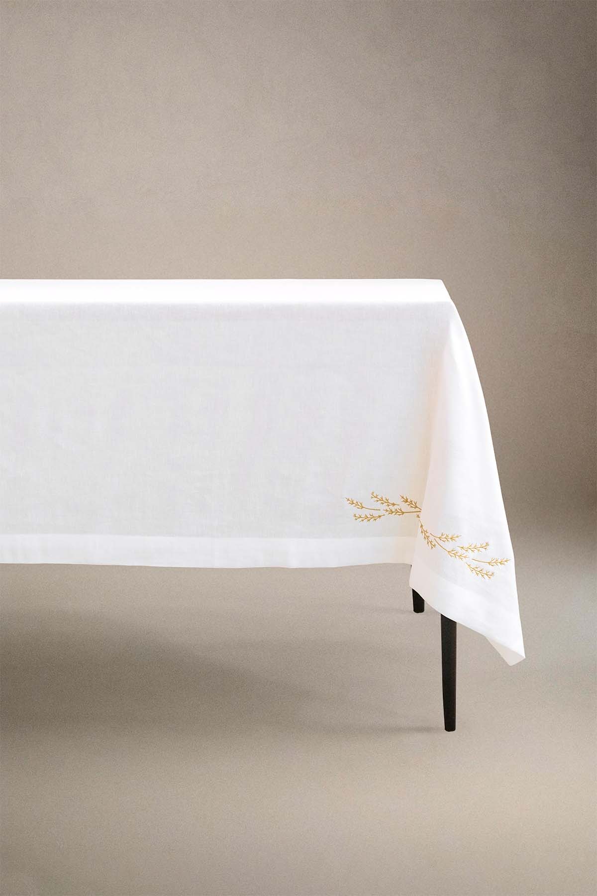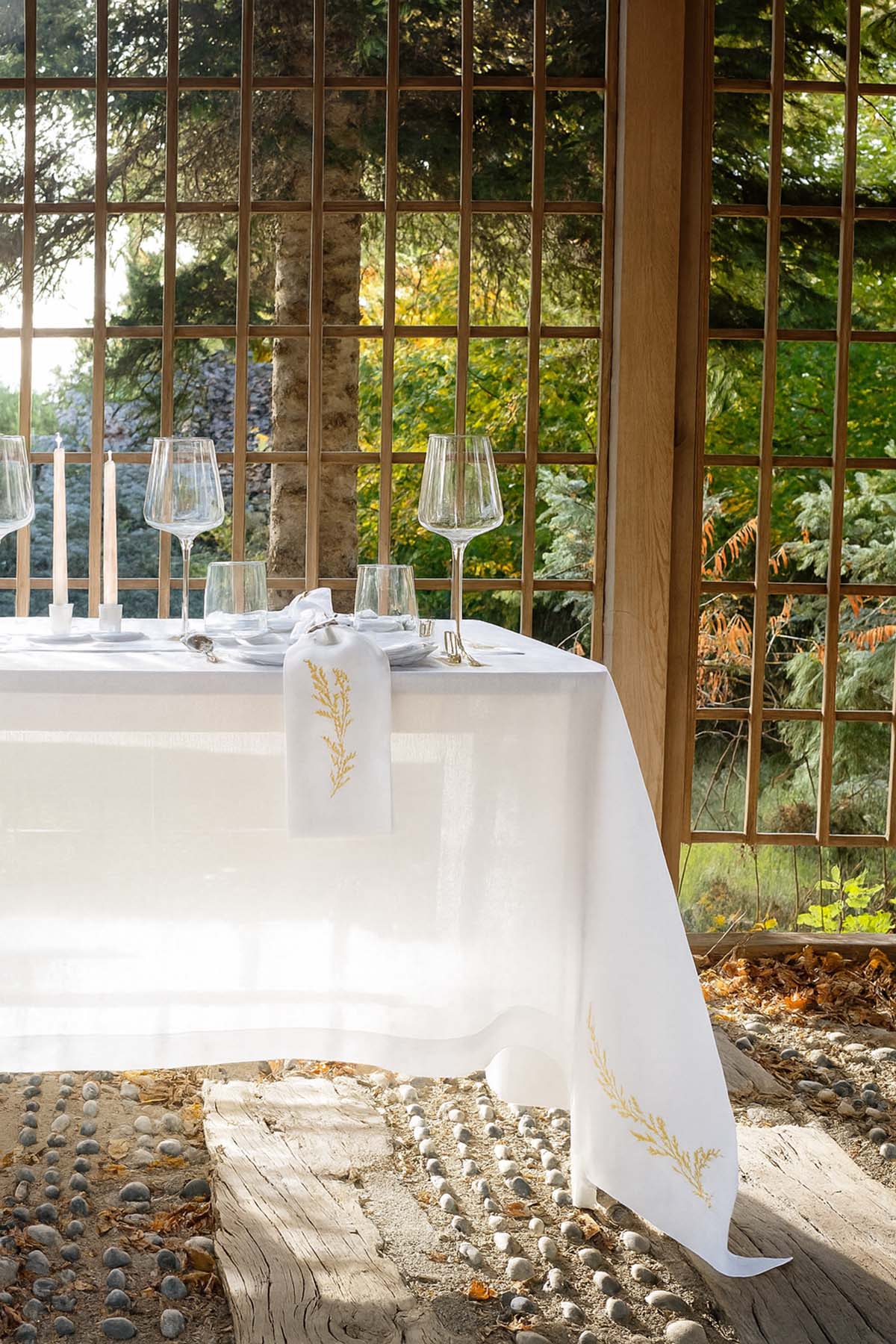 Doğal keten kumaştan üretilen bu yaprak nakışlı masa örtüsü, sofralara zarif ve zamansız bir şıklık katar. İnce işçiliğe sahip nakış detayları modern ve klasik masa düzenleriyle uyum sağlar. 8-10 kişilik 150x250 cm ve 10-12 kişilik 150x320 cm ebat seçenekleriyle özel davetlerden günlük kullanıma kadar her ortamda estetik bir görünüm sunar.