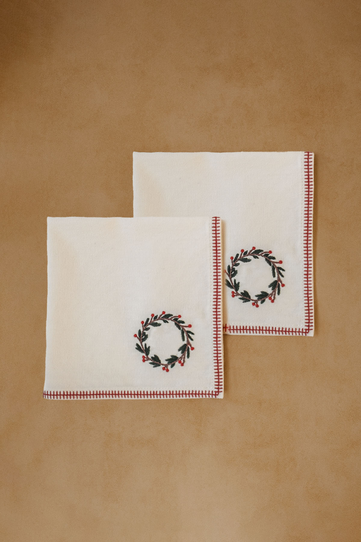 Kış ruhunu sofralara taşıyan bu 2’li nakışlı pamuk peçete seti, 40x40 cm ölçüsü ve özenli berry çelenk nakışıyla zarif bir görünüm sunar. %100 pamuk dokusu sayesinde yumuşak, dayanıklı ve günlük kullanıma uygundur. Kırmızı dikiş detaylarıyla yılbaşı sofralarından sıcak kış buluşmalarına kadar her masa düzenine doğal bir şıklık katar.