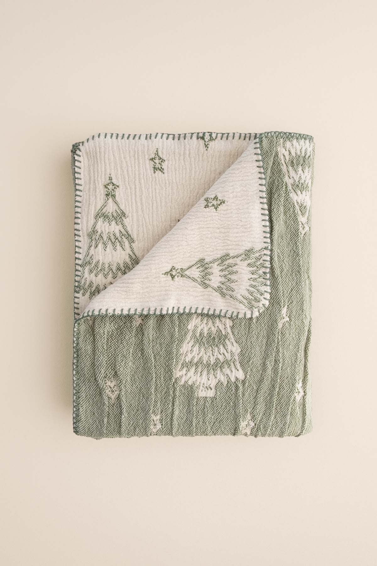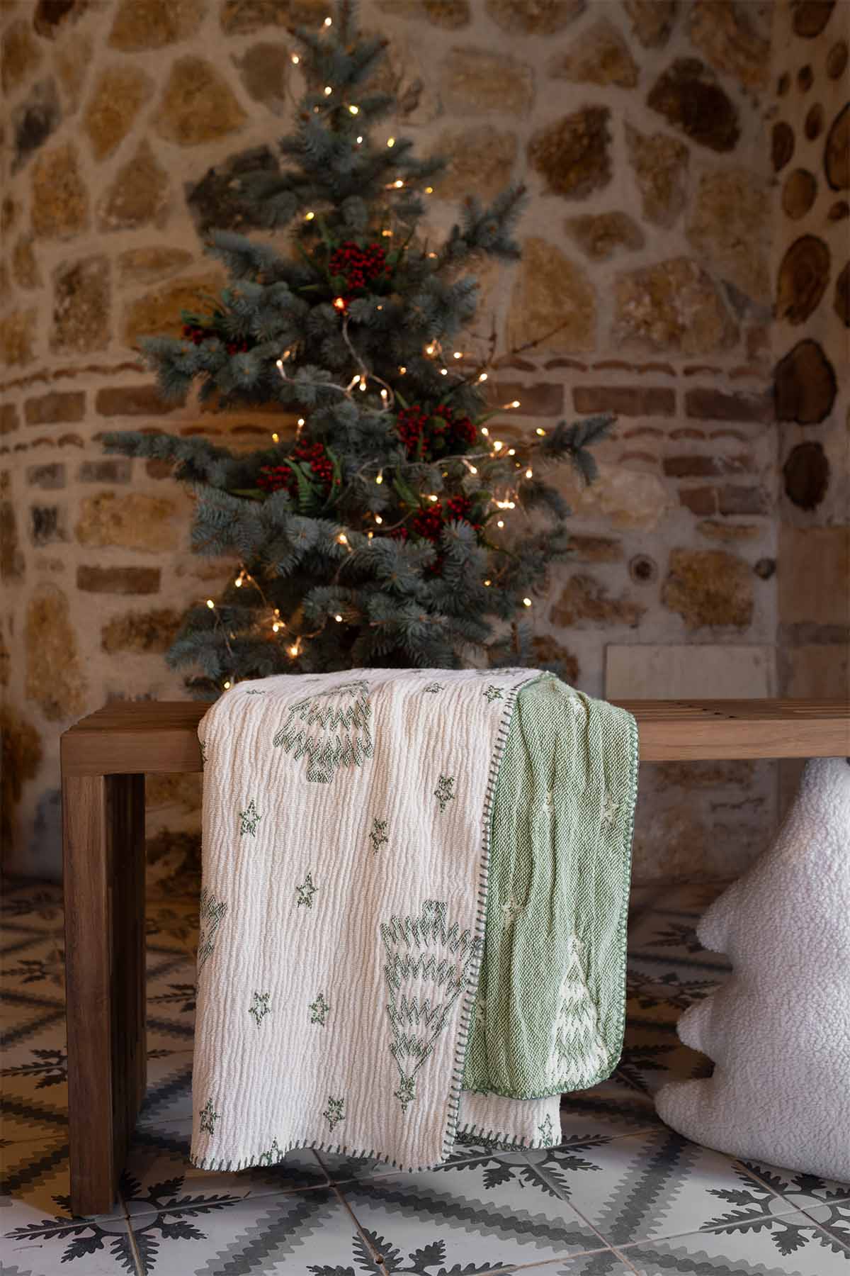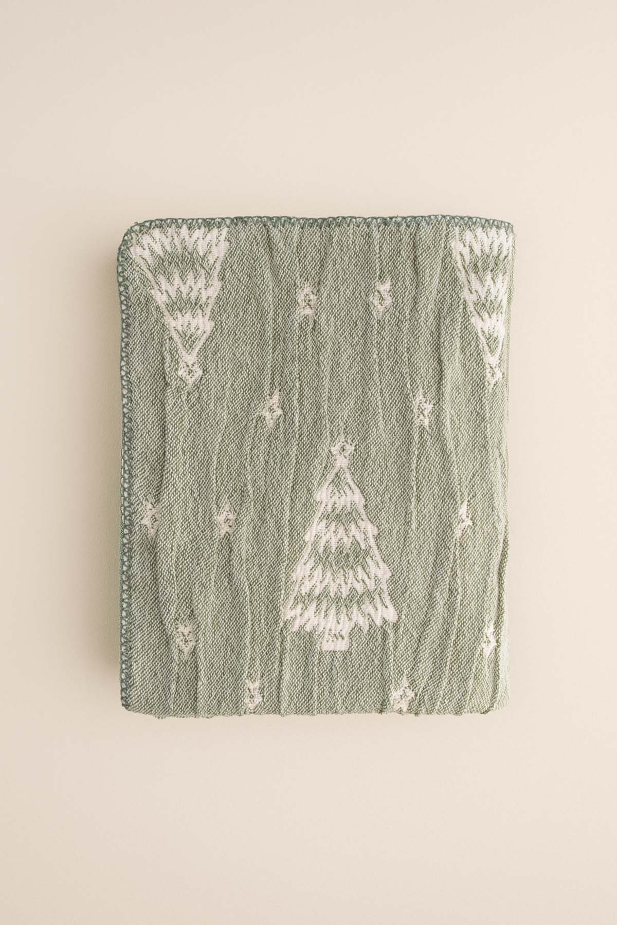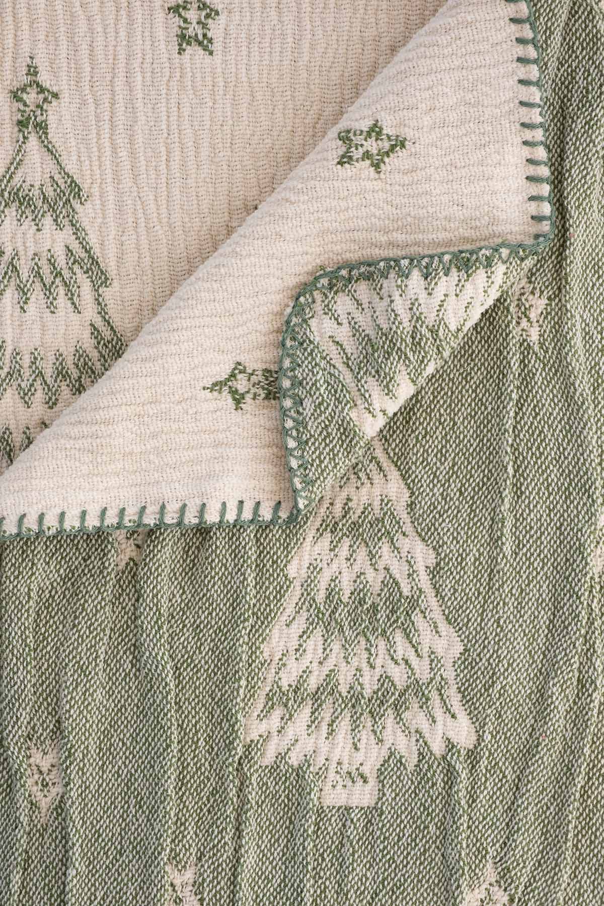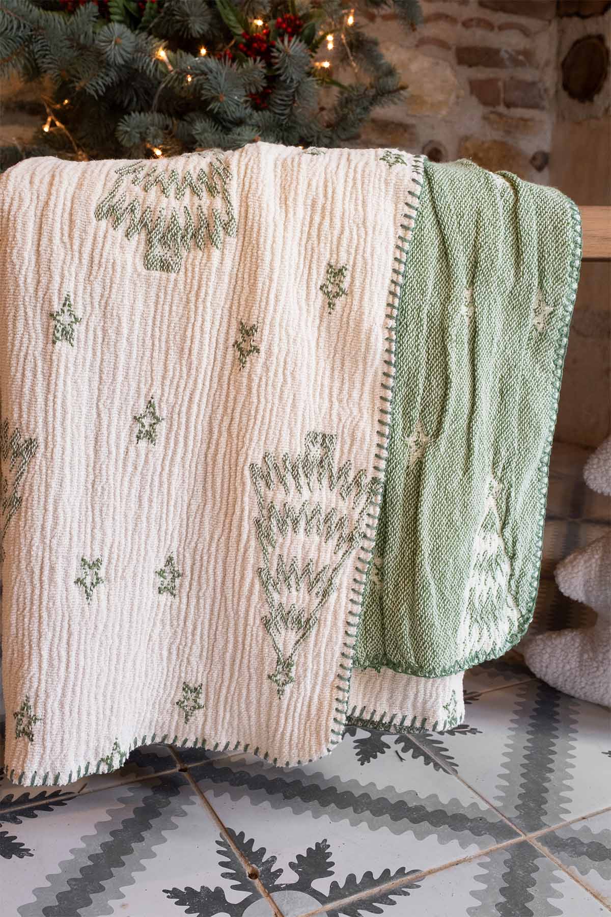 Çam ağacı deseniyle jakarlı pamuklu şönil battaniye, yumuşak dokusu ve doğal tonlarıyla yaşam alanlarına sıcaklık katar. %100 pamuk yapısı konfor sunar. 100x170 cm ölçüsüyle kanepe veya yatak üzerinde dekoratif bir tamamlayıcıdır. Çift taraflı kullanıma uygun hali ile dilenirse yeşil yönü dilenirse krem yönü kullanılabilir.
