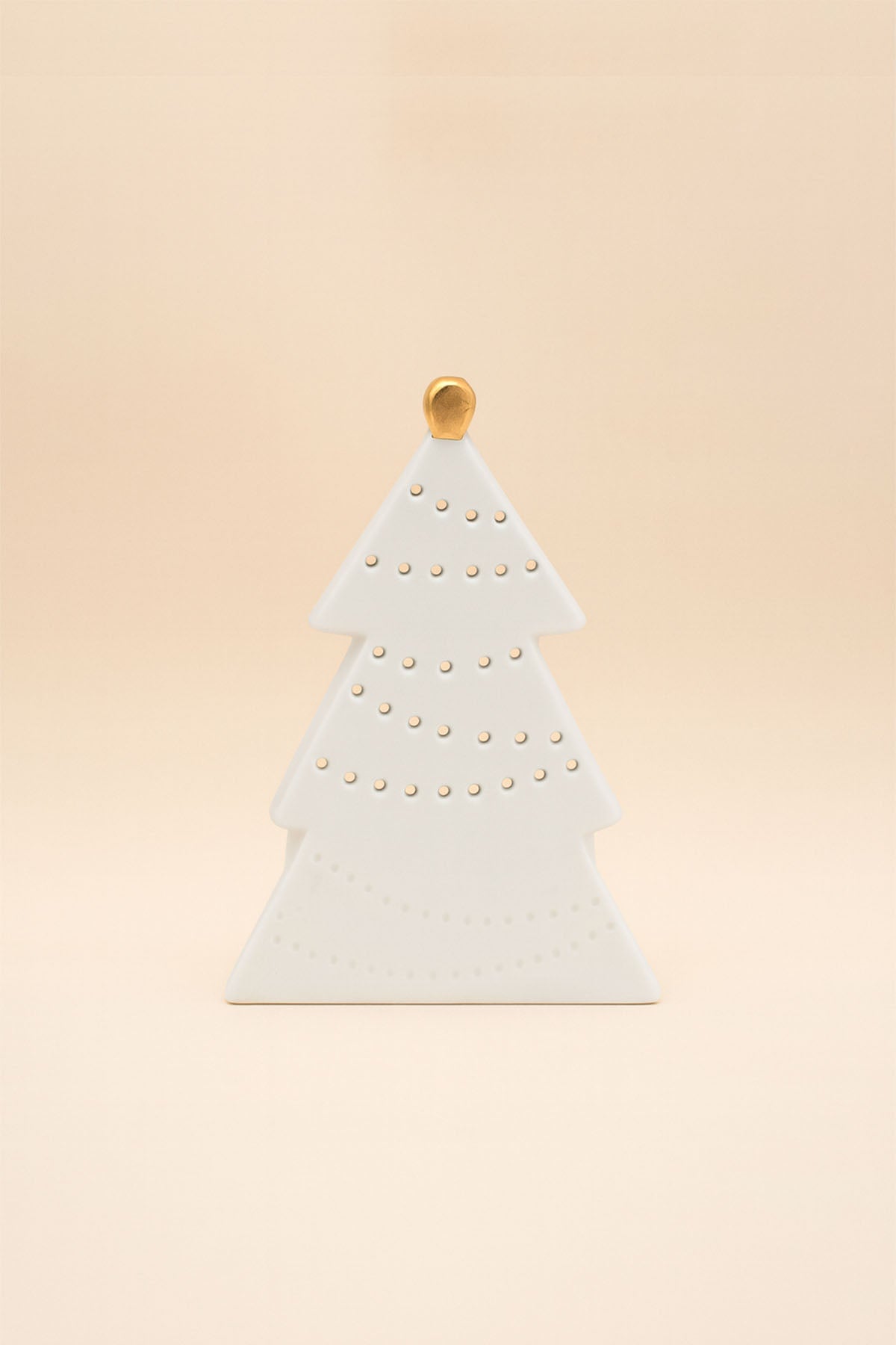 Çam ağacı formundaki bu porselen tealight mumluk, üzerindeki delikli desenler sayesinde ışığı zarif bir şekilde dışarı yansıtarak sıcak ve huzurlu bir ambiyans oluşturur. Mat beyaz yüzeyi ve tepesindeki altın detay, ürüne modern ve zarif bir görünüm kazandırır. 6,5x5,5x9 cm ölçülerindeki bu dekoratif mumluk, özellikle kış ve yılbaşı dönemlerinde evinize şık bir atmosfer katar.