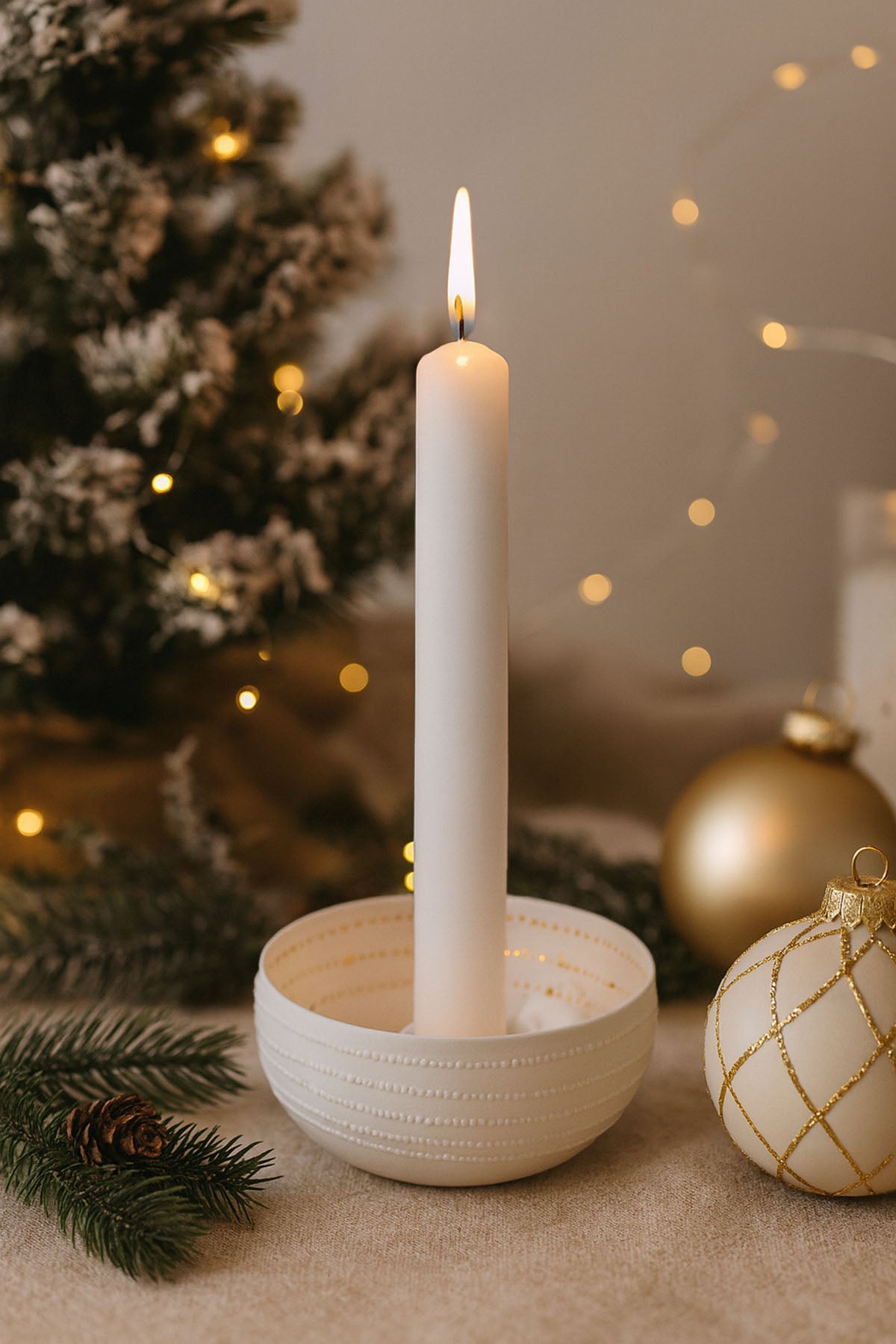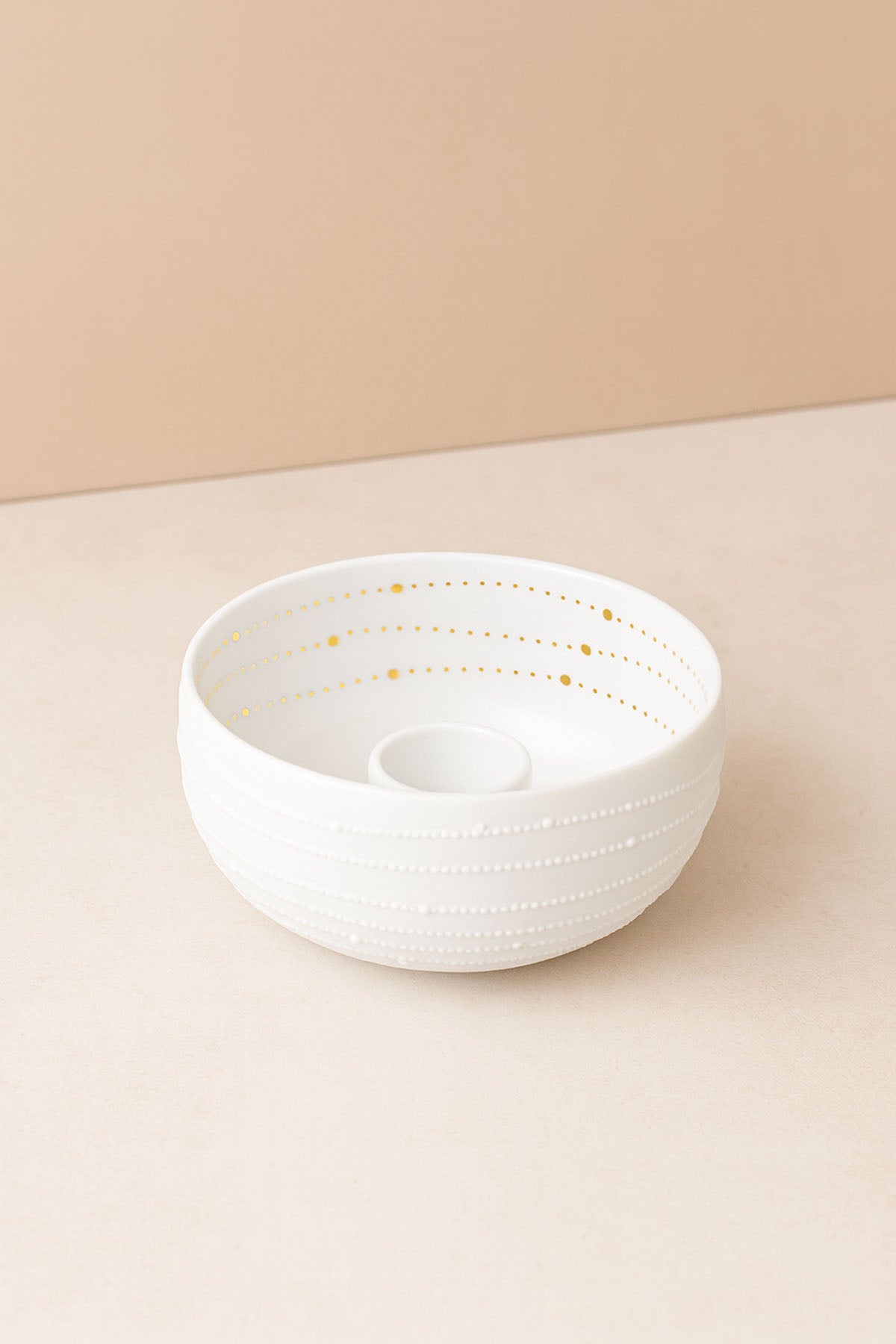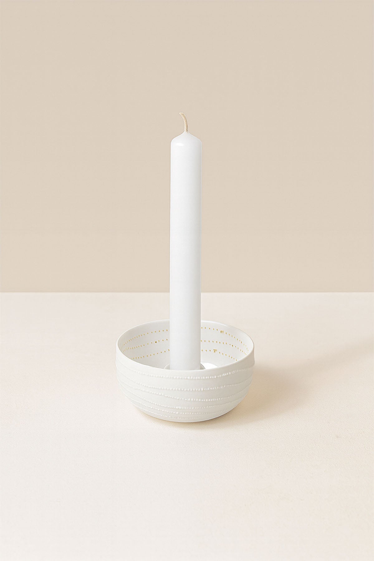 Mat beyaz porselen yüzeyindeki çizgi ve nokta desenleriyle öne çıkan bu mumluk, altın iç detayı sayesinde ışığı sıcak bir şekilde yansıtır. Modern kase formu, mum ışığının mekâna yumuşakça yayılmasını sağlar. Sofralar ve dekoratif köşeler için şık bir tamamlayıcıdır. 9,5x5 cm.