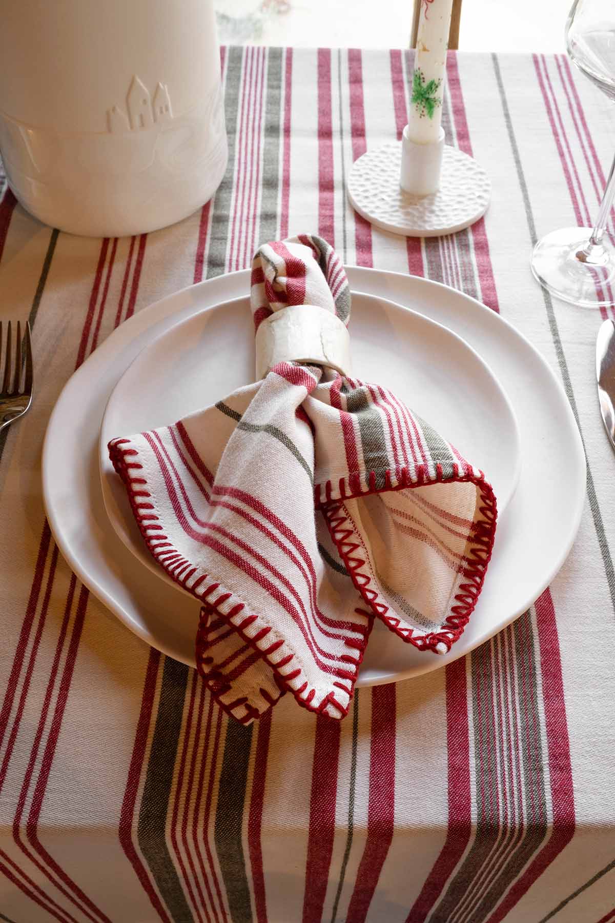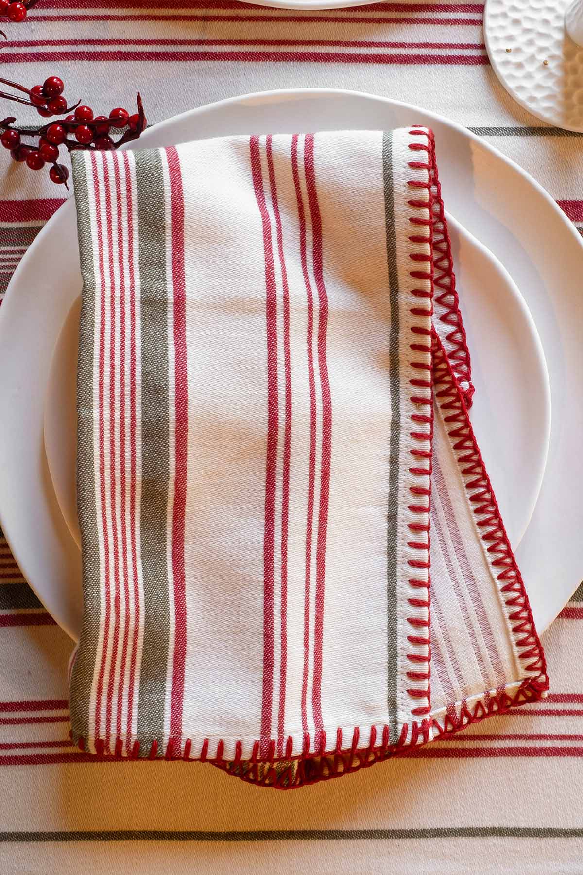 %100 pamuktan üretilen 2’li çizgili peçete seti, dekoratif dikişli kenar süslemesi ile sofralara sıcak ve zarif bir dokunuş katar. 45x45 cm ölçüsündeki bu peçeteler, iplik boya tekniğiyle üretilmiş dayanıklı kumaşı sayesinde uzun süre formunu korur. Masa örtüsüyle mükemmel bir uyum sağlar.