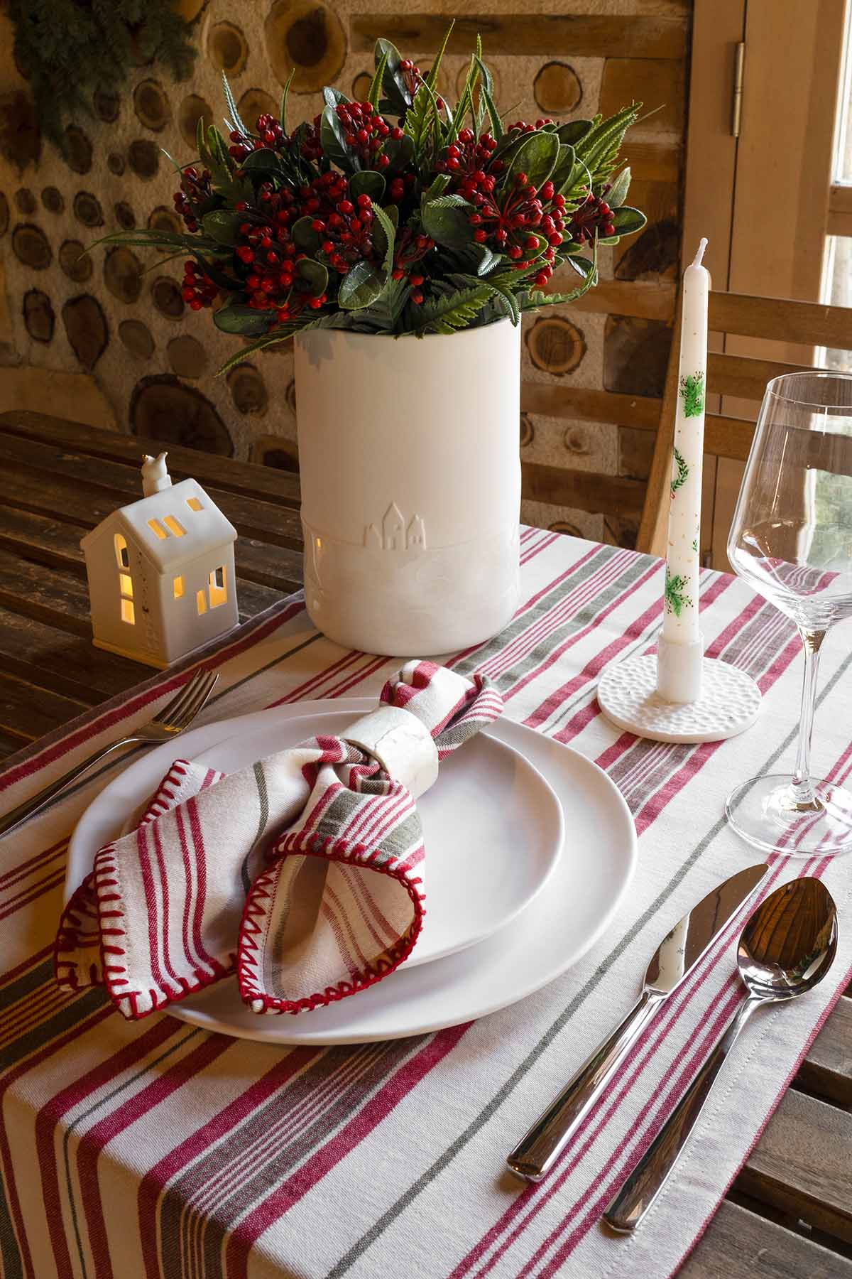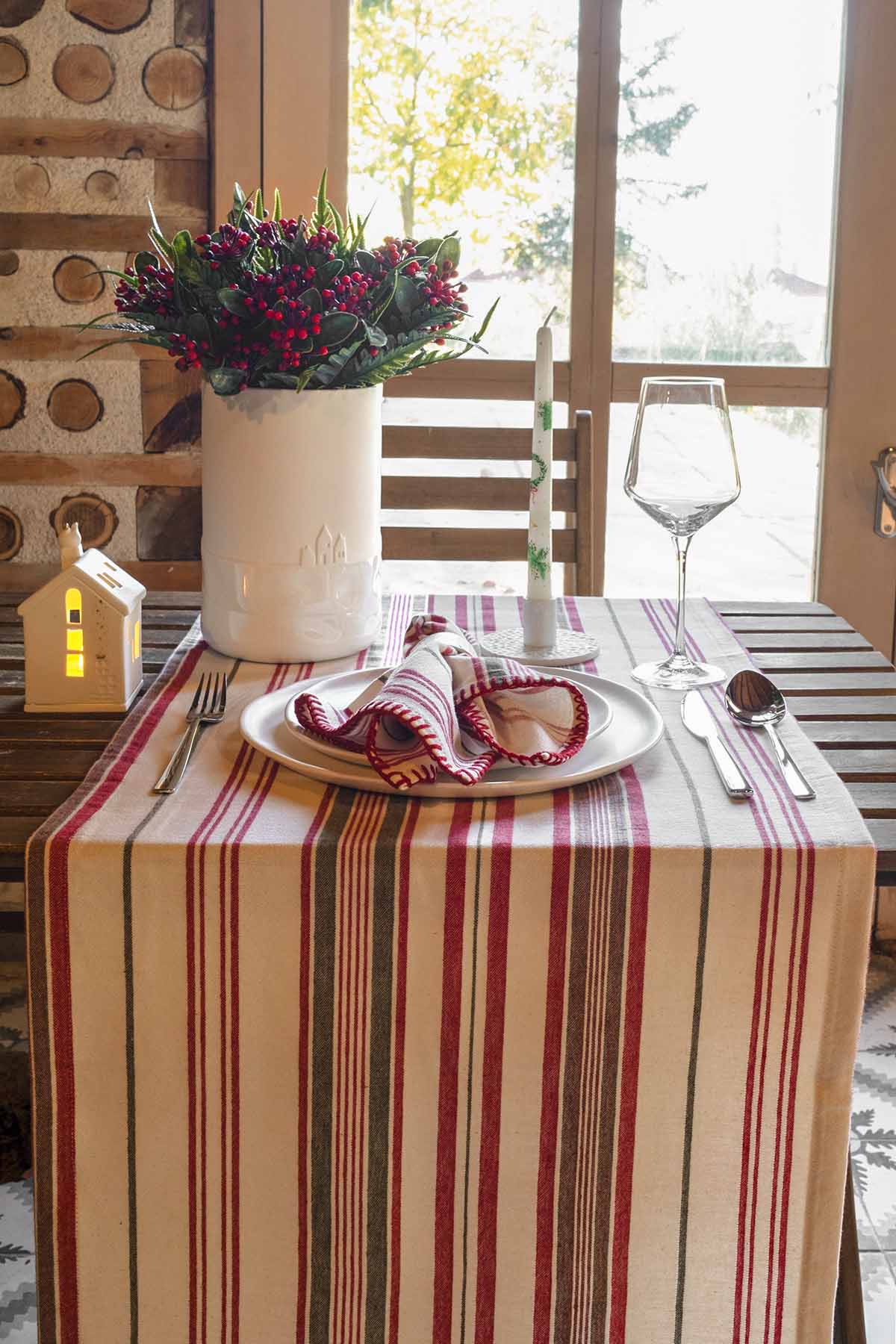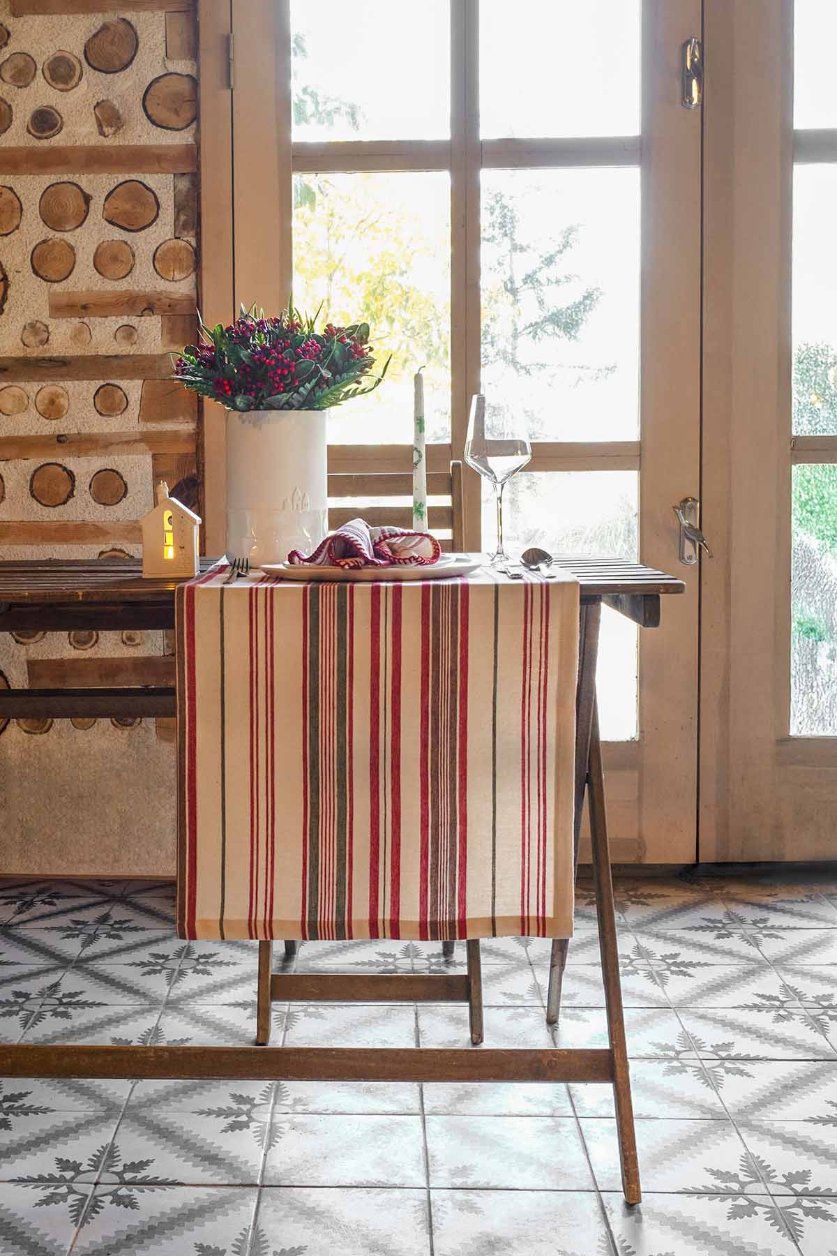 %100 pamuktan üretilmiş çizgili runner, 45x160 cm ve 45x250 cm ebat seçenekleriyle farklı kullanım şekillerine uygun olarak tasarlanmıştır.