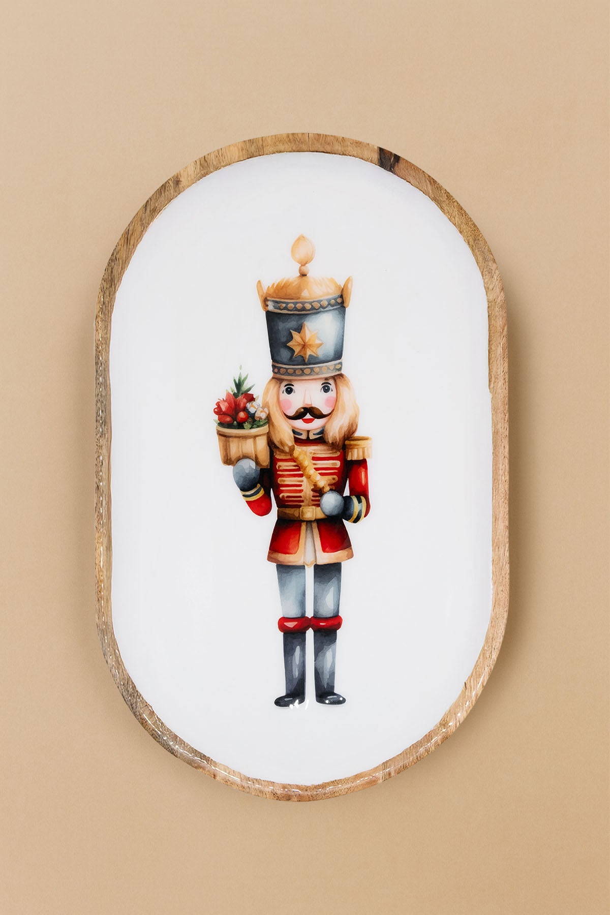 Doğal mango ağacından üretilen bu oval sunum tabağı, tepsi, merkezindeki klasik fındıkkıran illüstrasyonuyla yılbaşı dekorasyonuna nostaljik ve zarif bir dokunuş katar. Beyaz zemin üzerindeki renkli figür ve doğal ahşap çerçeve, sunumlarda sıcak ve şık bir görünüm oluşturur. 41x25 cm ölçüsüyle sofralarda, konsollarda veya dekoratif düzenlemelerde yılbaşı ruhunu stil sahibi bir şekilde yansıtmak için ideal bir parçadır.