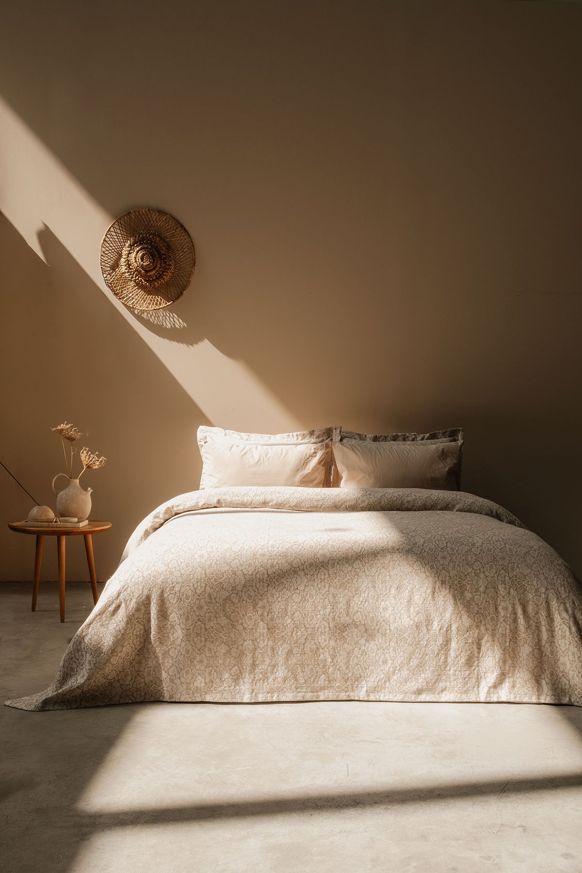 Floral Desenli Jakarlı Çift Kişilik Yatak Örtüsü ve Yastık Seti, 240x260 cm ebatındaki geniş yatak örtüsü ve 2 adet 50x70 cm ölçülerindeki şık yastık kılıflarıyla yatak odanıza zarif bir dokunuş sunar. %100 Pamuk.