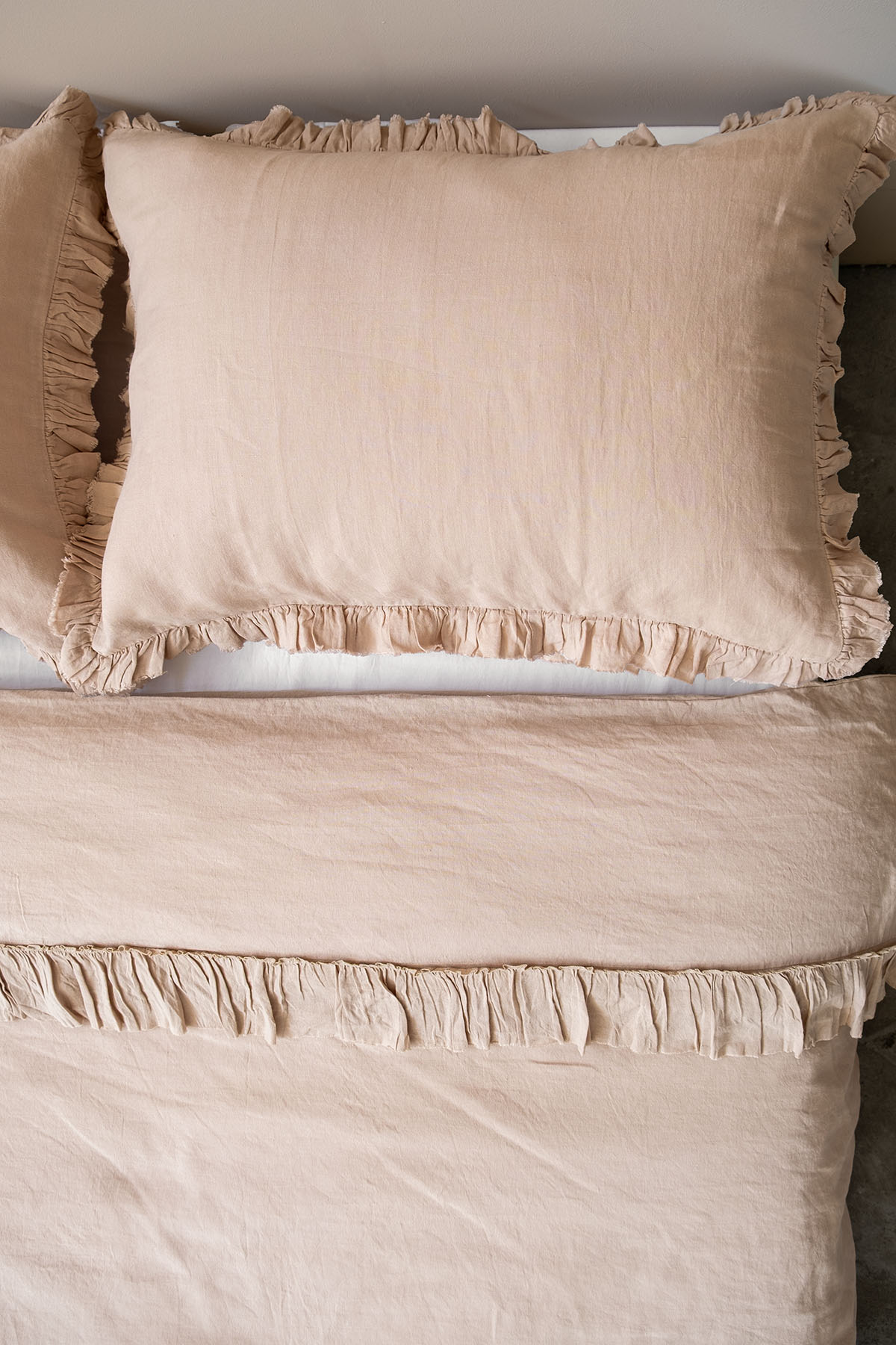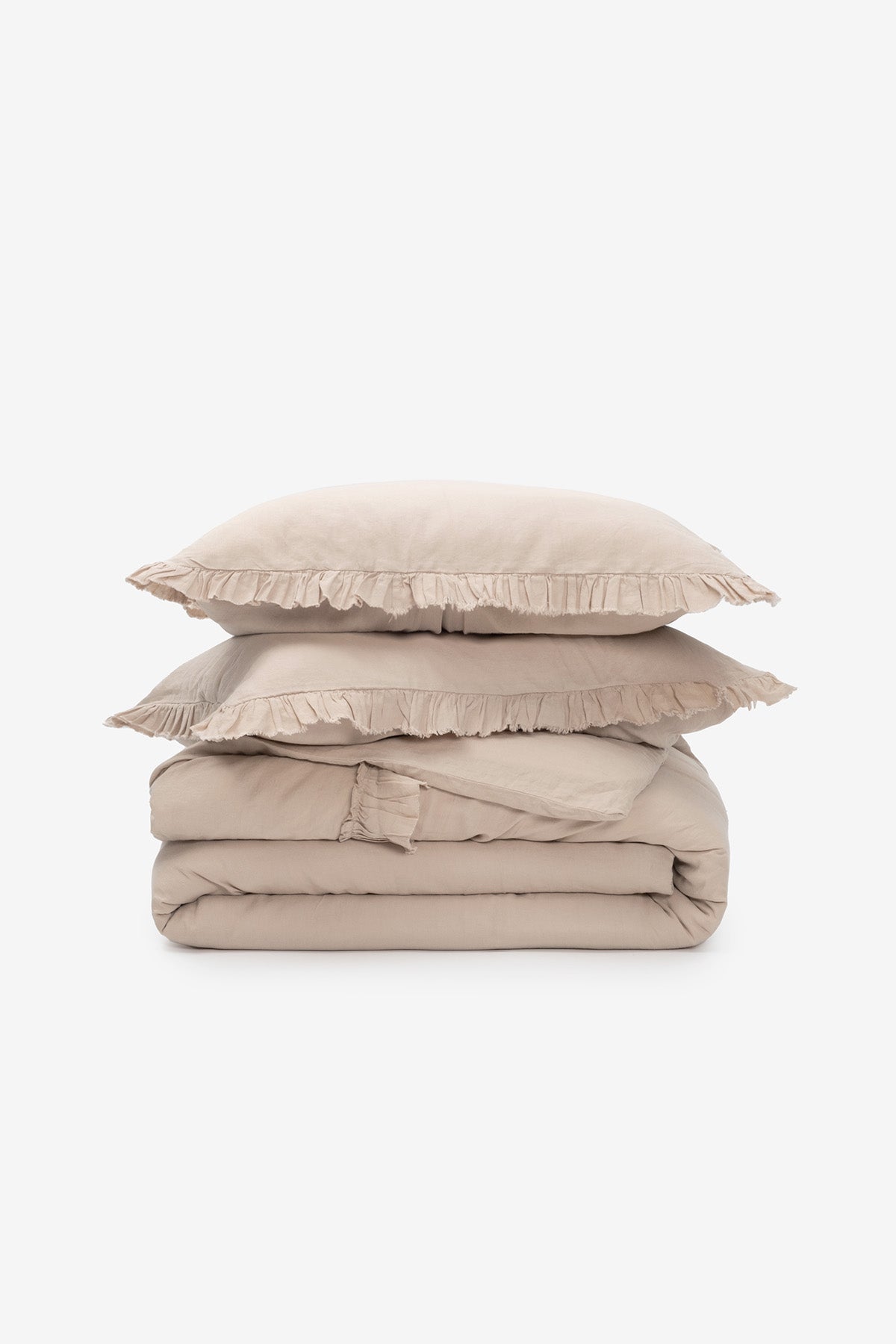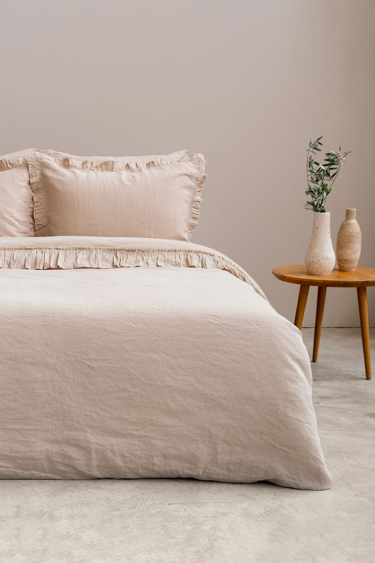 Frill Fırfırlı Keten Karışımlı Çift Kişilik Nevresim Seti Kum Beji