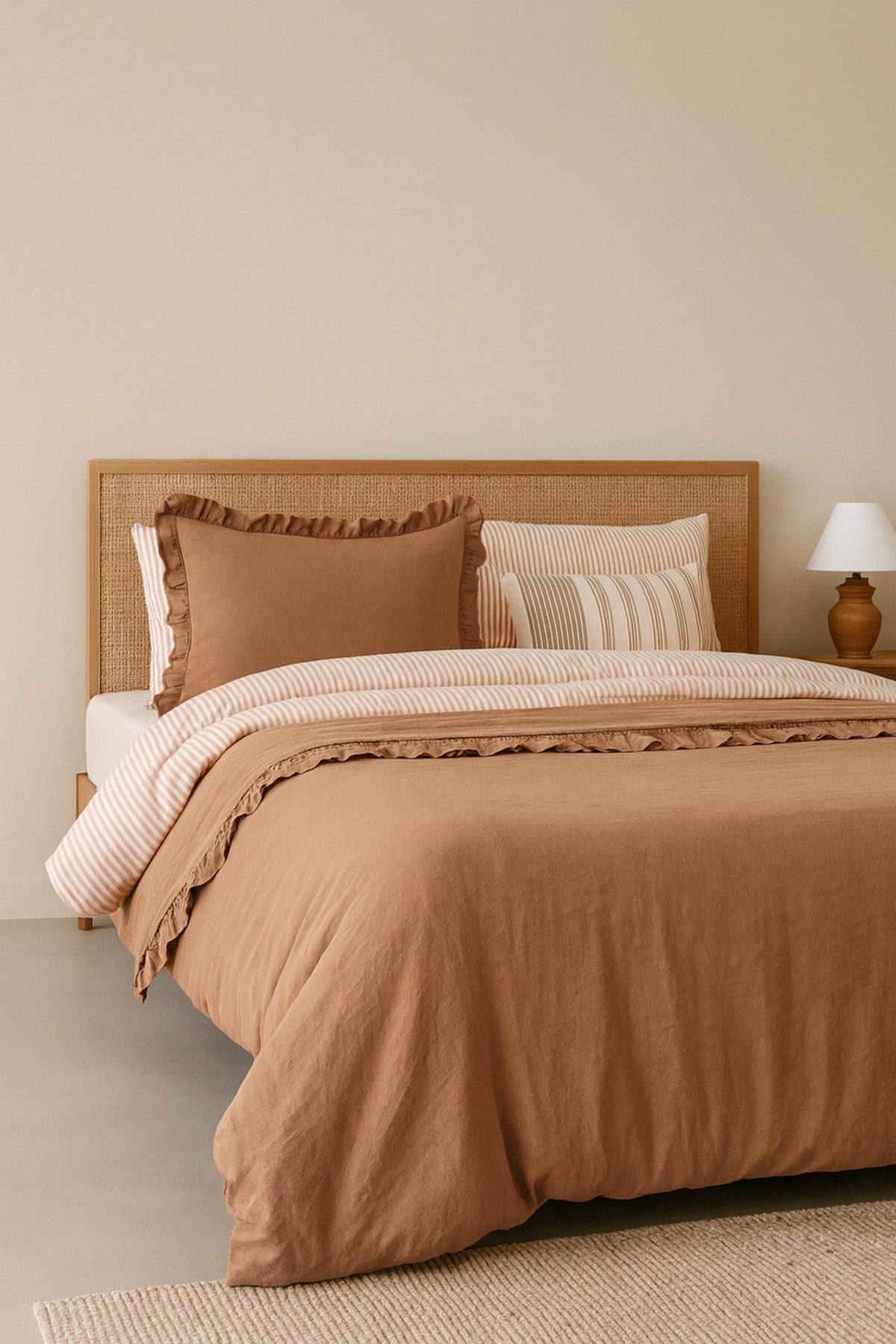 Frill Fırfırlı Keten Karışımlı Çift Kişilik Nevresim Seti Karamel