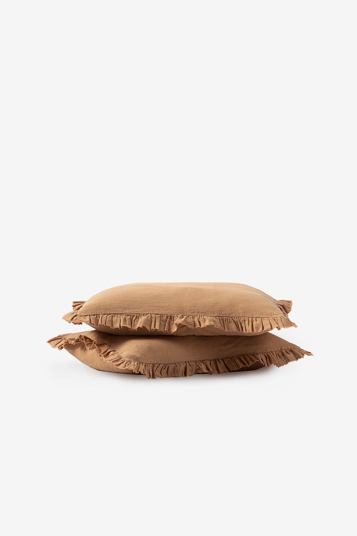 Frill Fırfırlı Keten Karışımlı 2'li Yastık Kılıfı Karamel