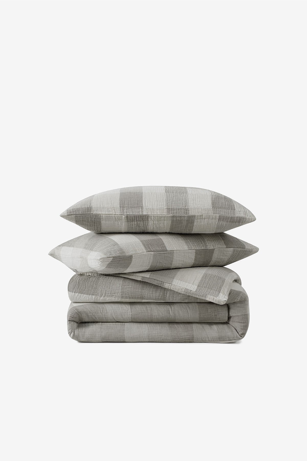 Gingham Gauze nevresim seti, üç katlı %100 pamuk muslin kumaşıyla yumuşaklık sunarken klasik gingham ekose deseniyle yatak odanıza şık bir dokunuş katar. Önceden yıkanmış ve Oeko-Tex sertifikalıdır.