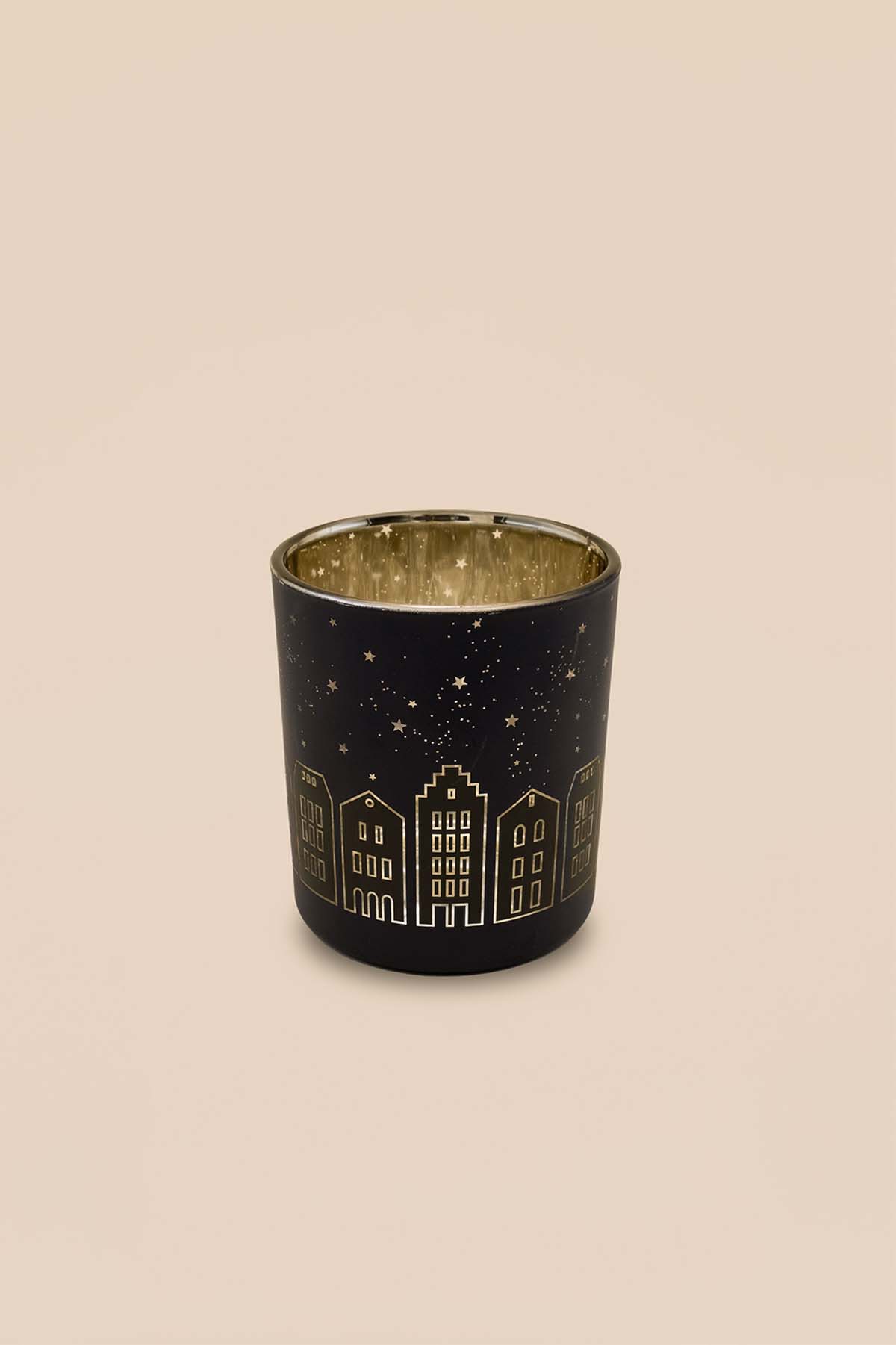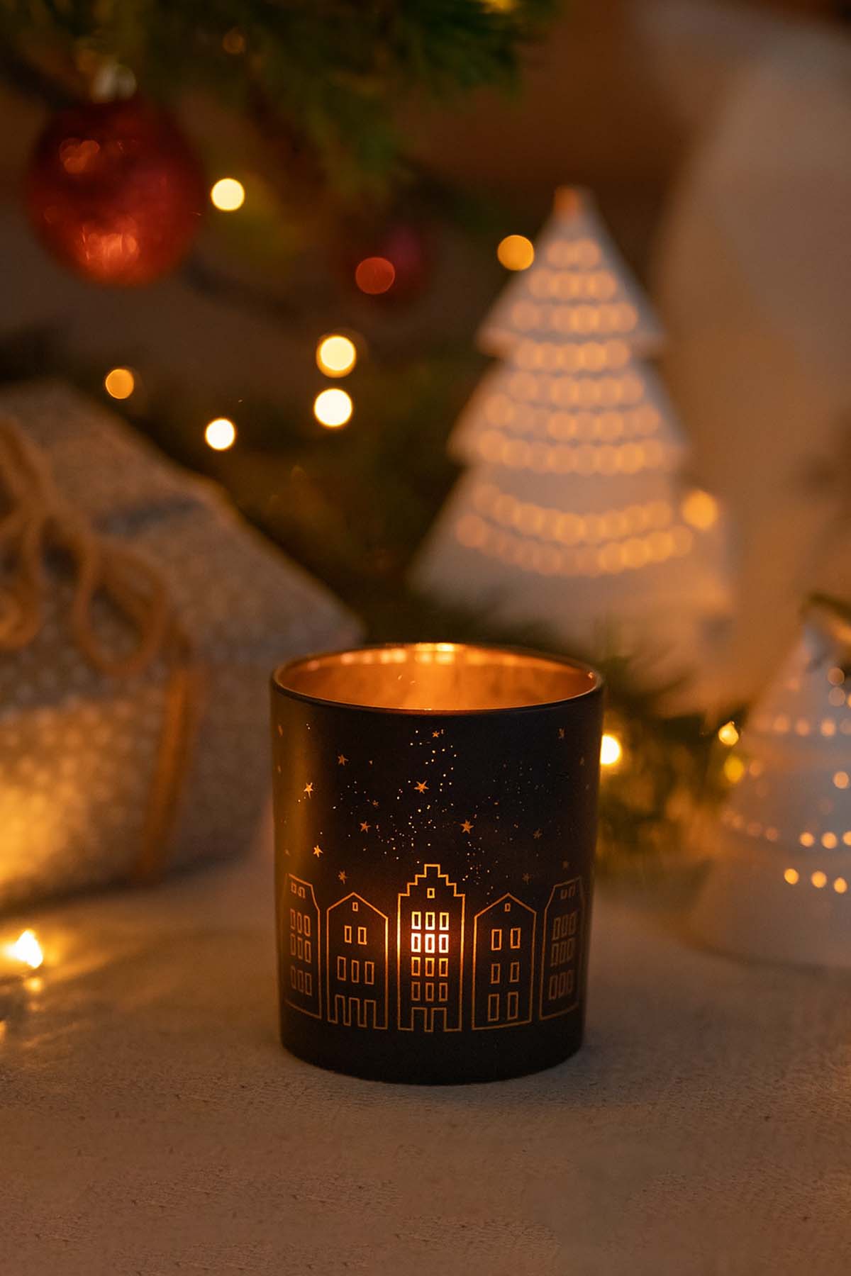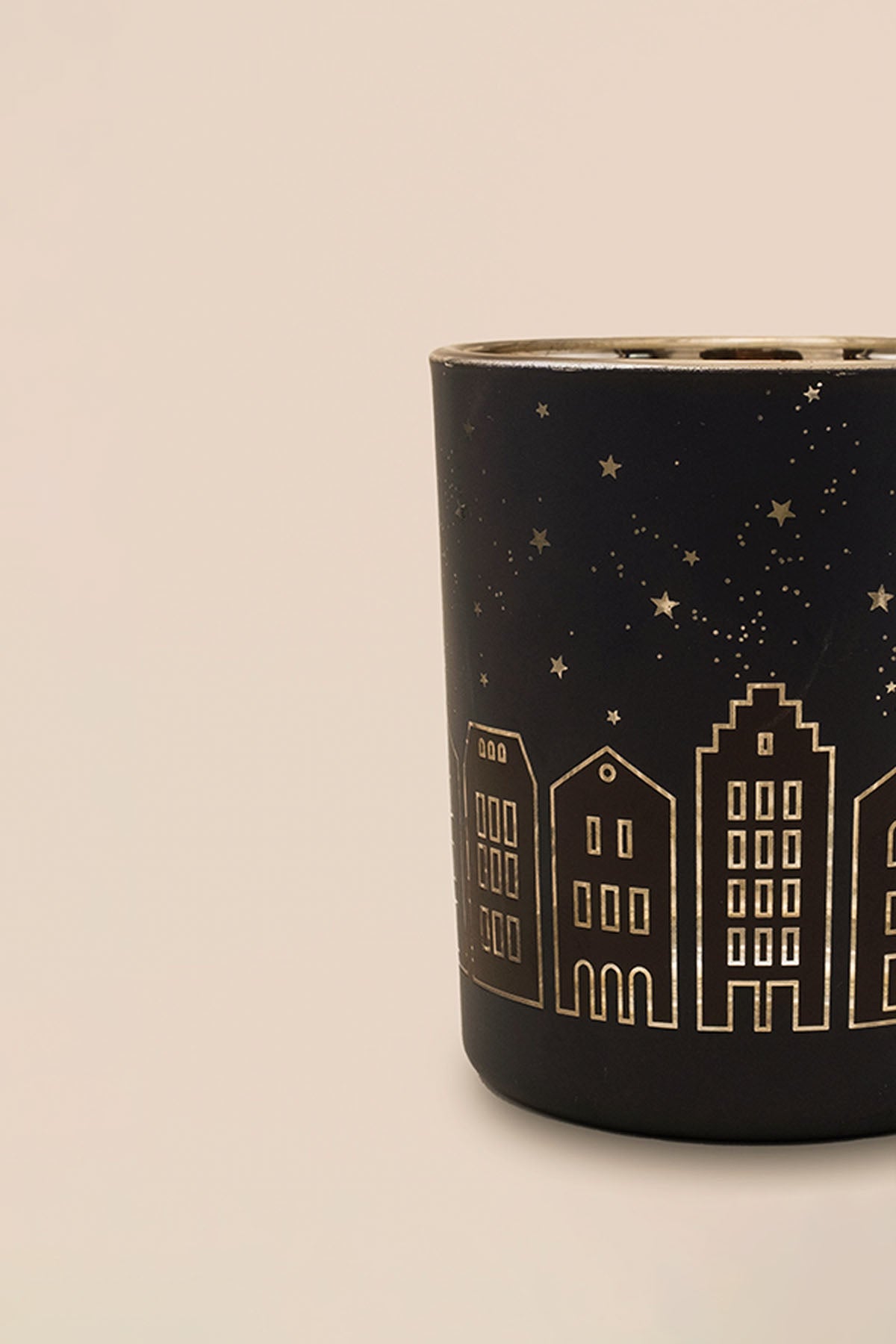 Koyu tonları ve altın ışıltıyı bir araya getiren Işıklı Evler Mumluk, iç yüzeyindeki parlak altın kaplama sayesinde mum ışığını güçlü bir şekilde yansıtır. Dış yüzeydeki şehir silueti deseni, ışık yandığında sıcak ve masalsı bir atmosfer oluşturur. Modern dekorasyonlara kolayca uyum sağlayan bu mumluk, oturma odası, yemek masası ve yılbaşı düzenlemelerinde etkileyici bir ambiyans yaratır. 7x8 cm.