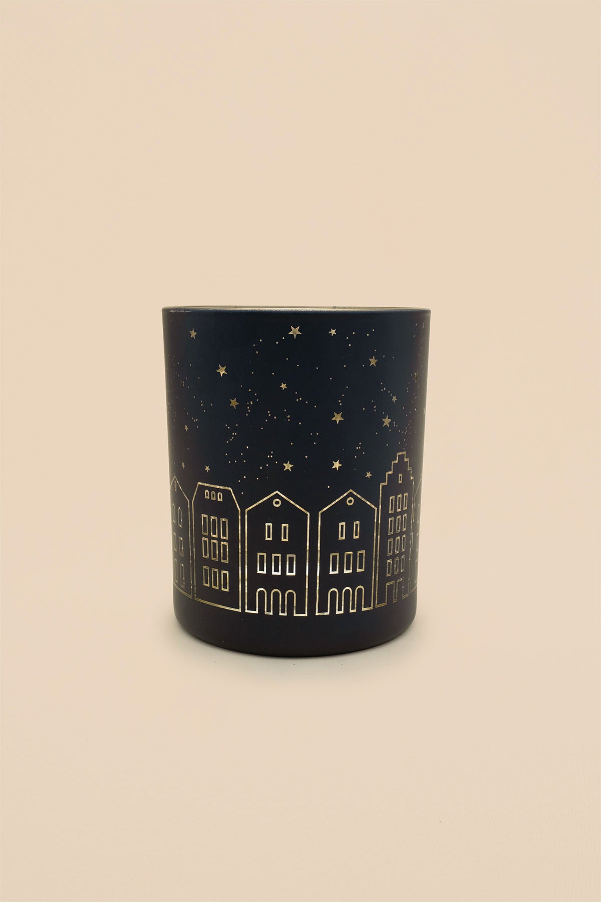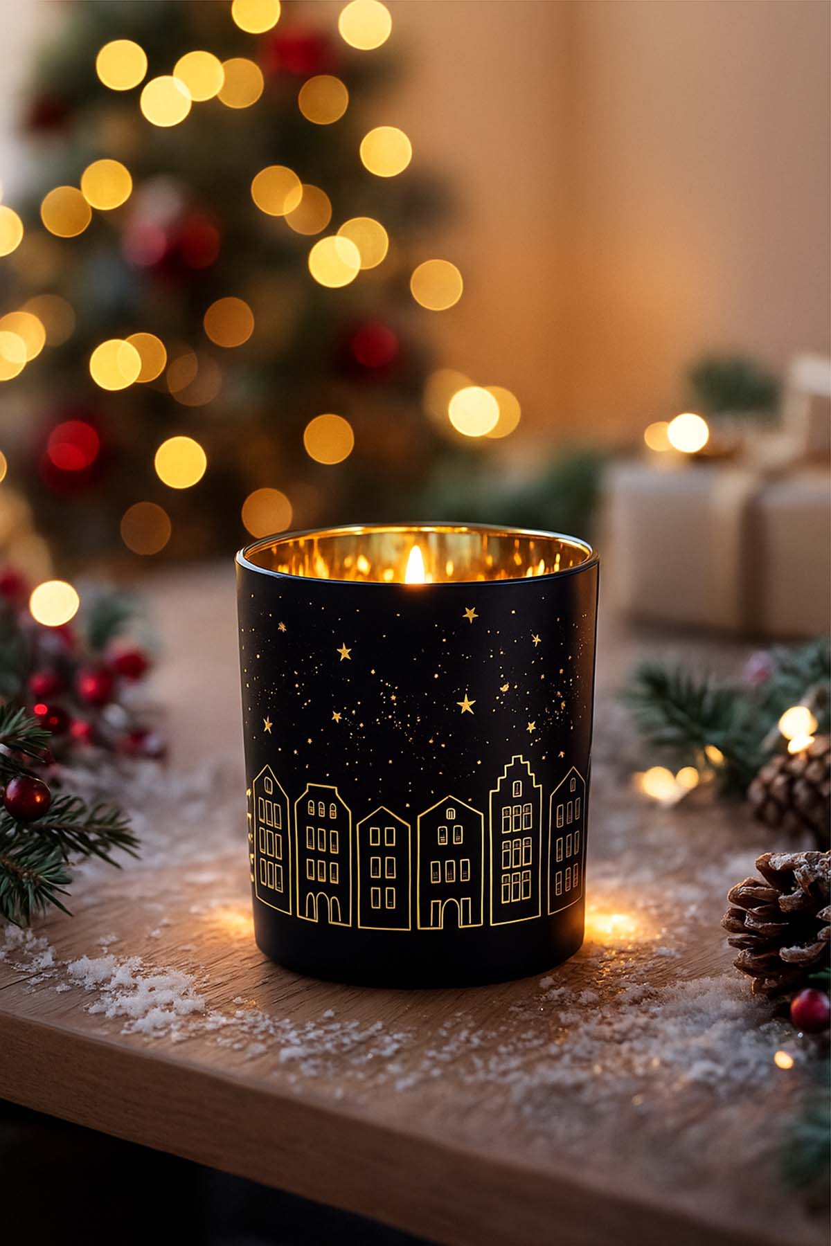 Koyu tonları ve altın ışıltıyı bir araya getiren Işıklı Evler Mumluk, iç yüzeyindeki parlak altın kaplama sayesinde mum ışığını güçlü bir şekilde yansıtır. Dış yüzeydeki şehir silueti deseni, ışık yandığında sıcak ve masalsı bir atmosfer oluşturur. Modern dekorasyonlara kolayca uyum sağlayan bu mumluk, oturma odası, yemek masası ve yılbaşı düzenlemelerinde etkileyici bir ambiyans yaratır. 8,5x10 cm.
