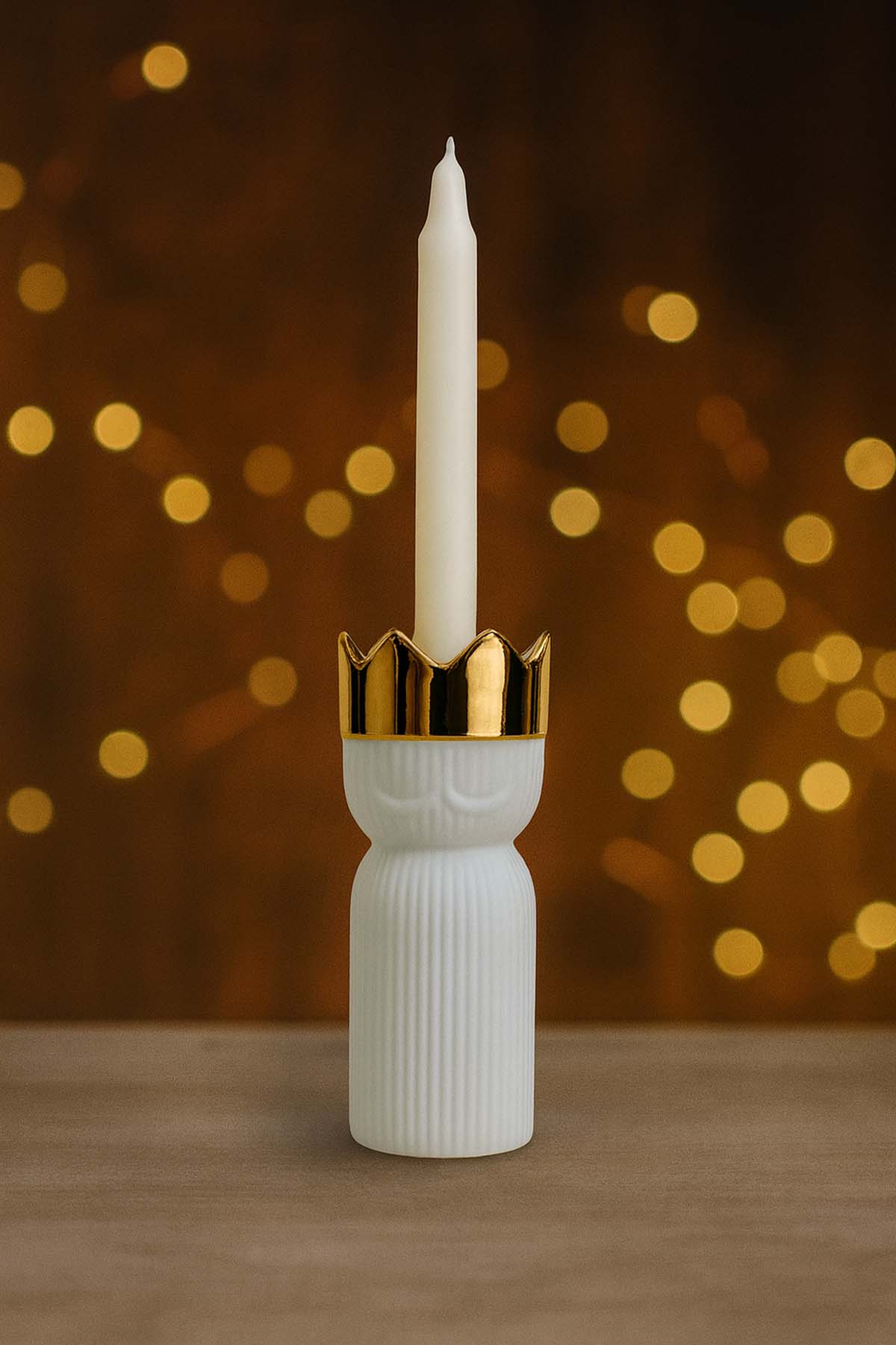 Zarif silüeti ve altın detaylarıyla öne çıkan Melchior Kral Işığı Mumluk, mat beyaz porselen gövdesiyle modern ve heykelsi bir görünüm sunar. Uzun mumlarla kullanıldığında mekâna yükselen bir ışık etkisi kazandırır ve sofralara, konsollara veya özel akşam dekorasyonlarına şık bir atmosfer ekler. Minimal tasarımı ve lüks dokunuşlarıyla her tarza kolayca uyum sağlar. 6x16,5 cm.