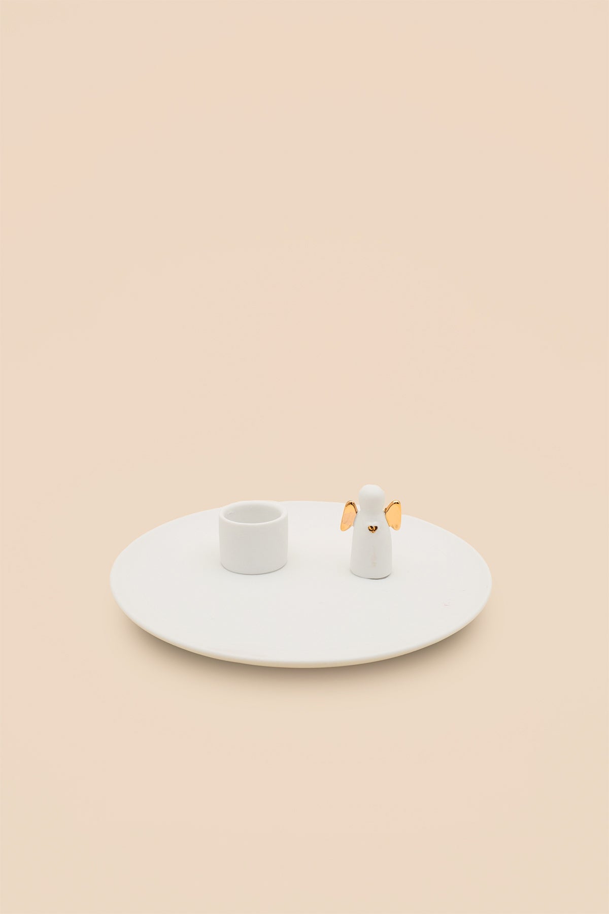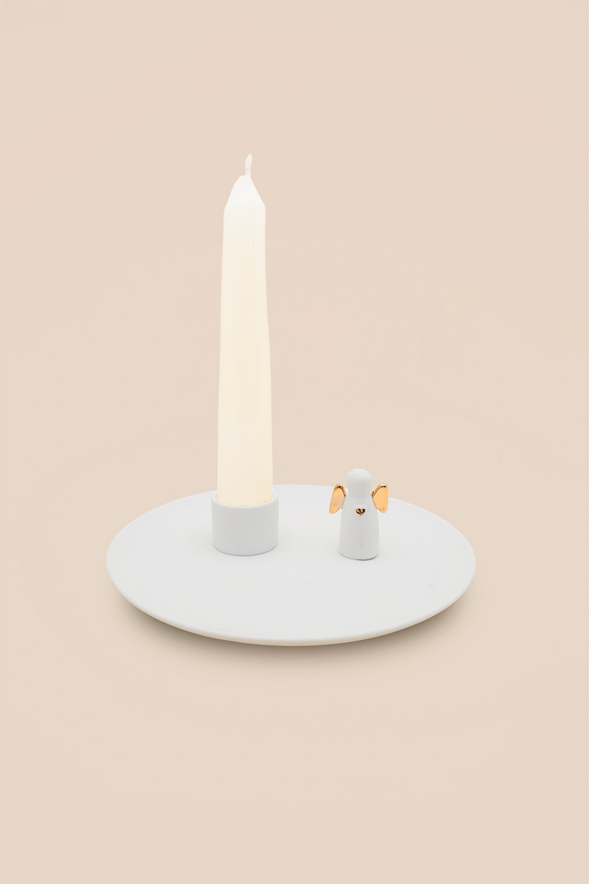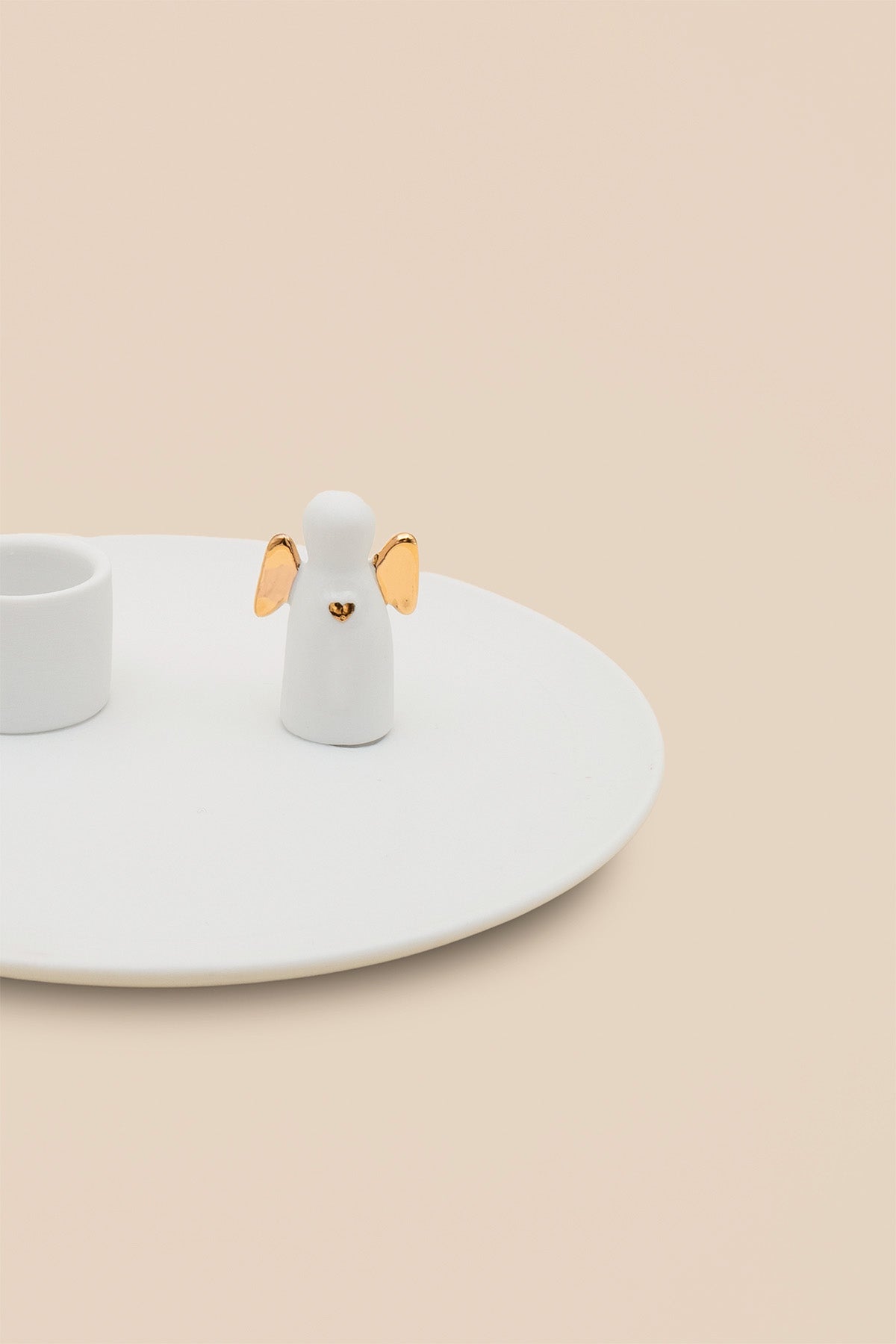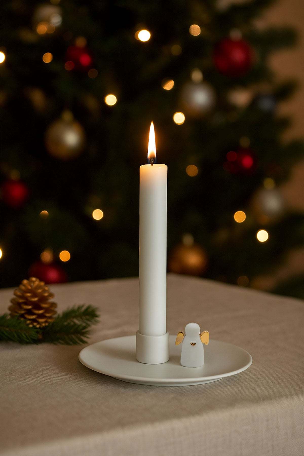 Melek Figürlü Mumluk, mat beyaz porselen yüzeyi ve altın detaylarıyla ışığı zarif bir şekilde yansıtır. Üzerindeki küçük melek figürü dekorasyona sakin ve duygusal bir dokunuş katarken, geniş tabanı ışığın yumuşakça yayılmasını sağlar. Kış dönemi, yılbaşı sofraları ve özel akşamlar için sıcak bir ambiyans oluşturan bu minimal tasarım, her dekorasyon stiline uyum sağlar. 14x4 cm.
