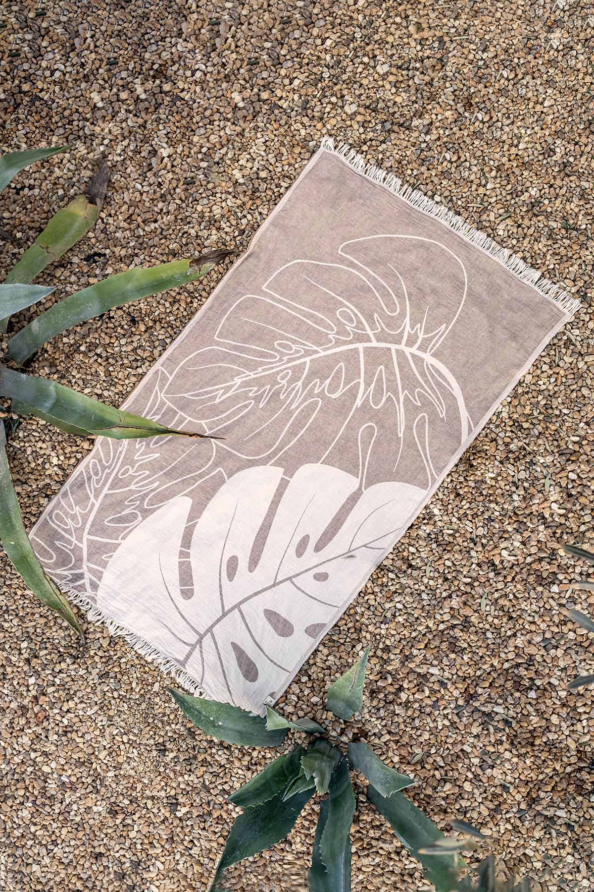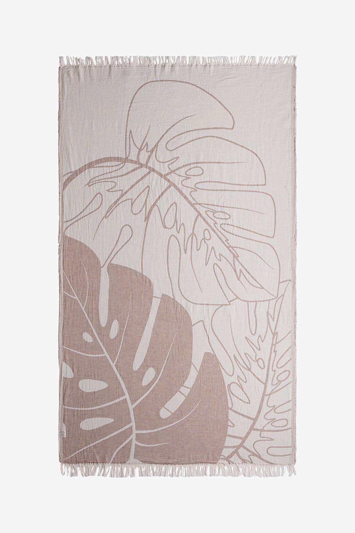 Monstera yaprağı jakarlı peştemal, %100 pamuk dokusu ve çift taraflı kullanım özelliğiyle hem şık hem de dayanıklı bir seçenektir. Hafif, hızlı kuruyan yapısı ve taşıma çantasıyla plaj, havuz ve banyo sonrası kullanım için idealdir.