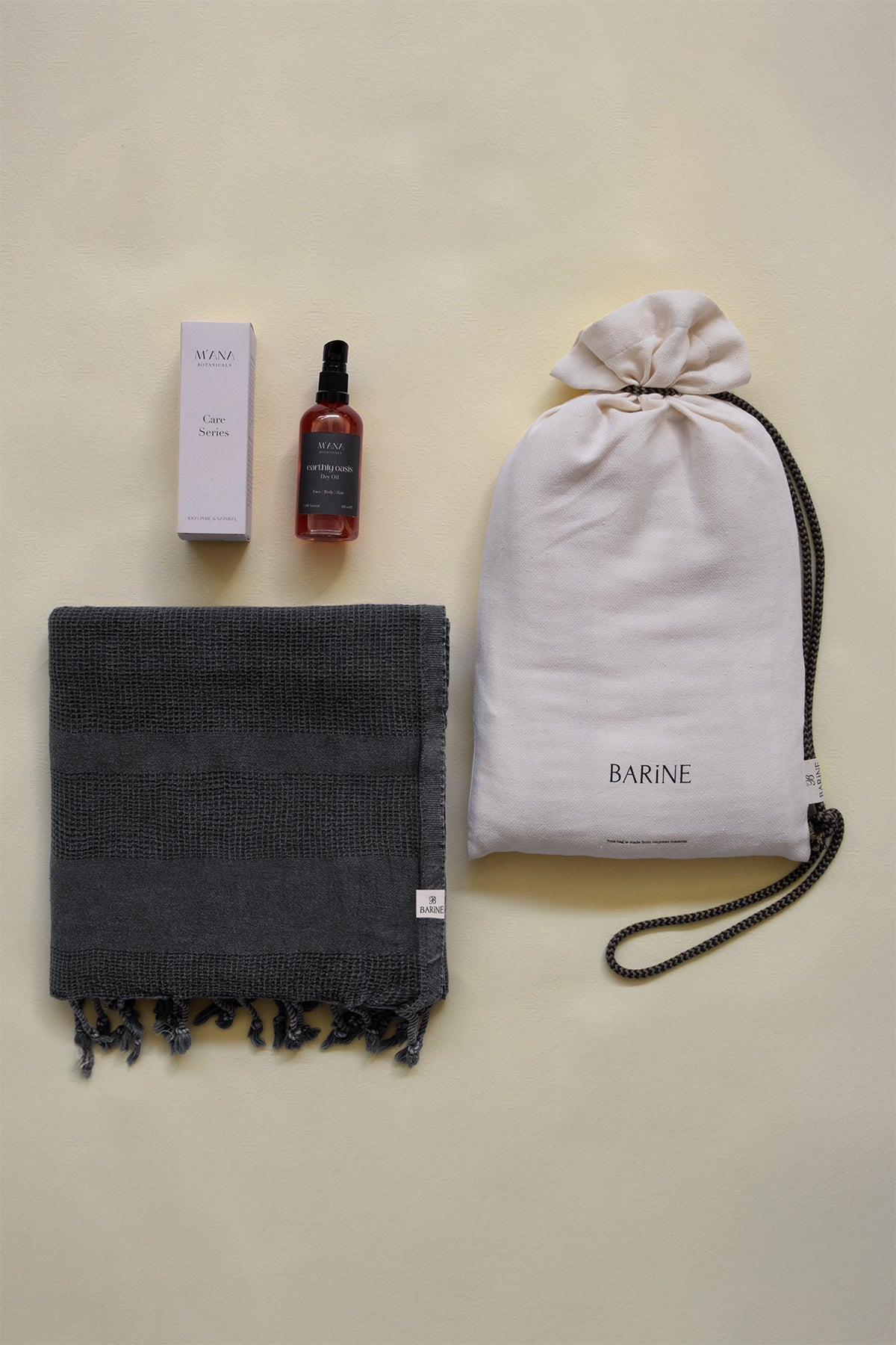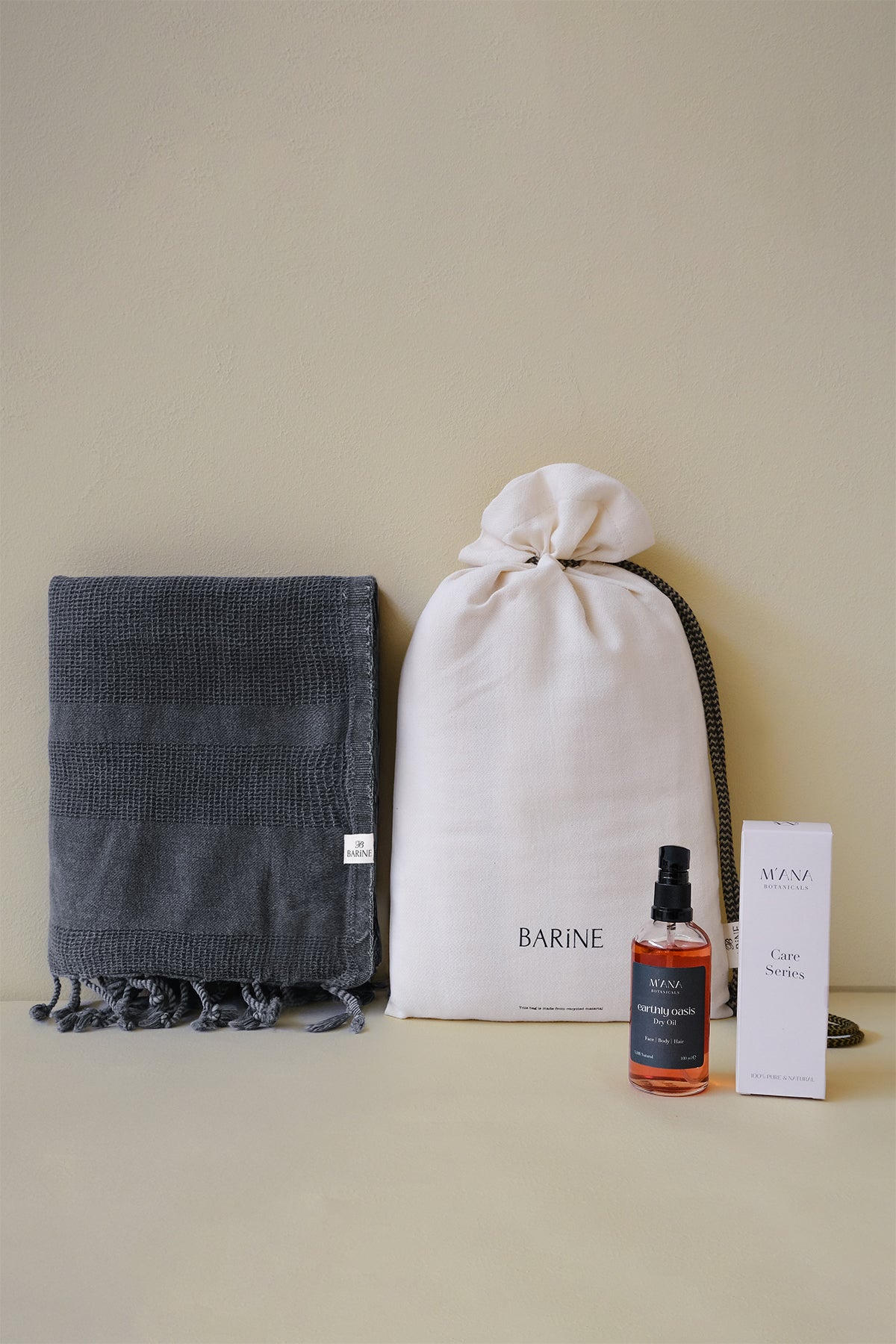 Barine X M’ana Stone Peştemal Hediye Seti, sade şıklığı ve doğal bakımı bir araya getirir. %100 pamuklu taşlama efektli pike dokulı peştemal, siyah tonlarıyla zamansız bir görünüm sunarken; Earthly Oasis kuru yağ, lavanta, paçuli ve ardıç yağlarıyla cildi nemlendirir ve yeniler. Şık taşıma çantasıyla her anınıza zarif bir dokunuş katar.