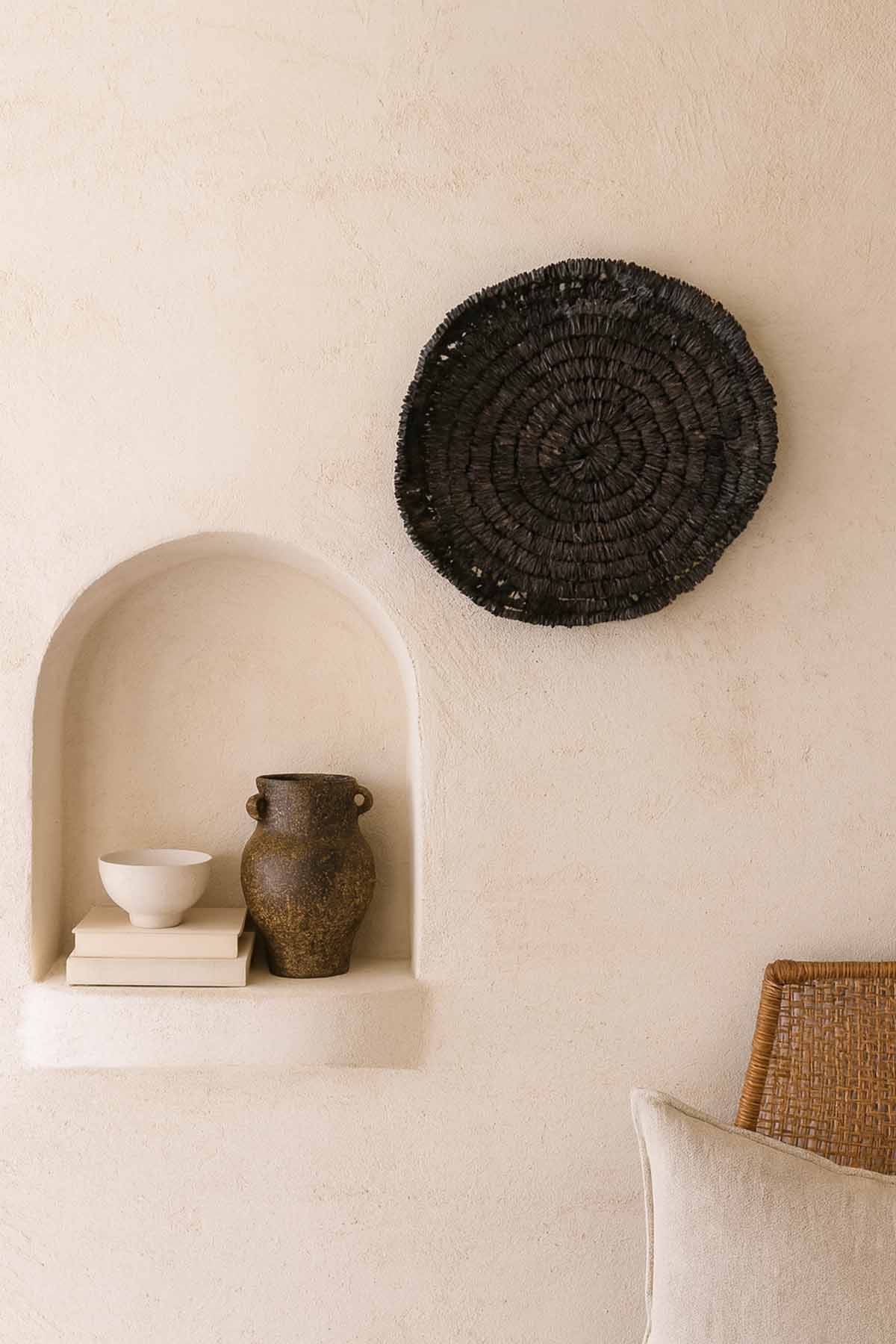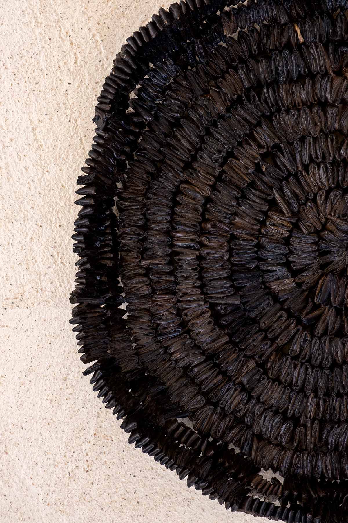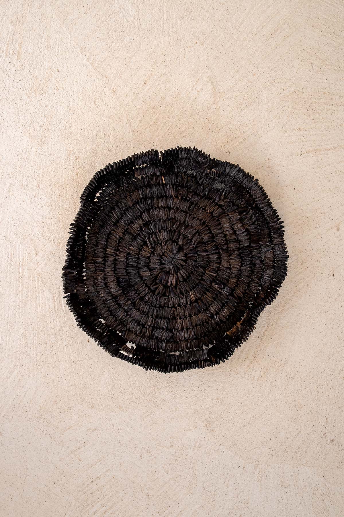 Siyah eskitme tekniğiyle renklendirilmiş su sümbülü liflerinden yapılan bu yuvarlak duvar dekoru, doğal dokusu ve modern görünümüyle duvarlara karakter kazandırır. 37 cm çapındaki el yapımı tasarım, her biri kendine özgü detaylar taşıyan özgün bir parçadır.