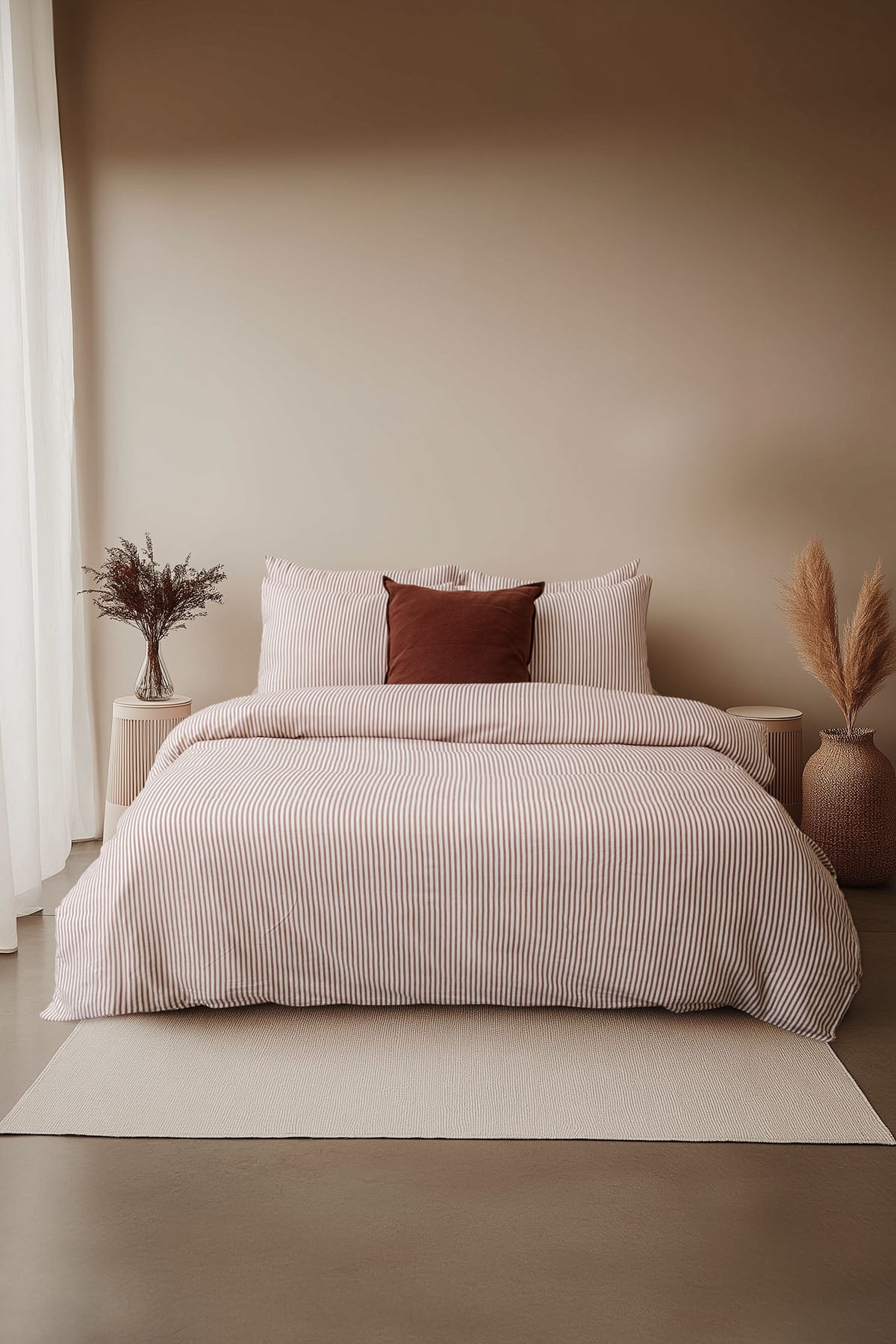 İnce Çizgili Pamuk Saten Çift Kişilik Nevresim Seti Kızıl Toprak